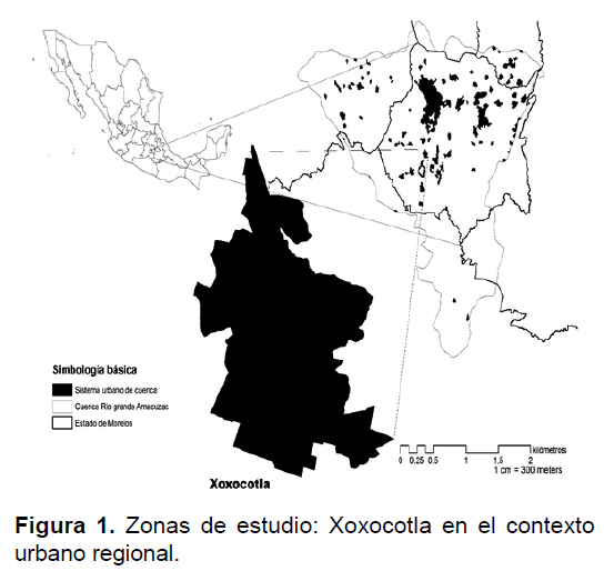 Área de estudio. Xoxocotla es una comunidad nahua de las 76 distribuidas en el estado de Morelos, que conserva su idioma (INEGI 2005) y cuya toponimia Xoxocotla significa xogotl = ciruela y tlan = lugar, el cual pertenece al municipio de Puente de Ixtla y se localiza a los 18º 42’ 50’’ N y 99º 13’ 46’’ W, a 1030 metros de elevación (Figura 1). La comunidad tiene particularidades poco consolidadas como ciudad, aun cuando cuenta con 40,000 habitantes, sólo 20% son económicamente activos dedicados sobre todo con actividades agropecuarias y comercio al por menor. Los indicadores de occidentalización descritos son: a)