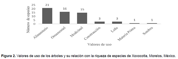 Un total de 40 huertos frutícola tradicional fue muestreado entre las dos áreas, que equivalen a 4.7% del total del parque registrado para 2010. Este total comprende 192 viviendas donde 57% (109) conservan el huerto frutícola tradicional, 21% aún conserva el sistema constructivo tradicional y 48% posee el frente sin ventanas como un rasgo arqueológico local. Los resultados ecológicos contribuyeron a entender la composición florística de los paisajes antiguos y urbanos de la zona de estudio, que en total está representada por una riqueza de 39 especies. A partir de allí, se elaboró una lista de especies arbóreas con sus respectivos nombres científicos, a la cual se agregan los nombres vernáculos. Esta lista fue organizada en dos grupos de especies: las del área antigua, cuya riqueza de especies fue de 29, y el área recientemente urbana con una riqueza de 32 especies; al comparar ambas áreas se encontró que se comparten 22 especies (Tabla 1). Las especies con mayor abundancia relativa son: tamarindo (Tamarindus indica, L), guamuchil (Pithecellobium dulce, Roxb.), benth (Bonete Jacaratia mexicana A. DC), guaje (Leucaena esculenta, Moc. y Sesees D.C.), Ehretia tinifolia (L.), anona (Annona squamosa, L), ficus llorón (Ficus benjamina, L.) especie que no reporta ninguna categoría de uso, ciruela (Spondias purpurea, L) y mango (Mangifera indica, L). El índice de diversidad de Simpson aportó información sobre la vegetación del paisaje urbano. Sus valores fueron para el área antigua 0.2 y para la recientemente urbana de 0.7, lo que señala que esta última se ha diversificado en relación con la antigua. De hecho, la similaridad entre los dos paisajes fue de 59.7%, el valor para especies nativas fue 49%, importante porque contiene especies silvestres con significado cultural, por ejemplo, la guayaba, la ciruela y el guamúchil (Tabla 1). Mediante el enfoque etnobotánico se colectaron e identificaron las especies útiles de árboles de los paisajes estudiados en 20 casas correspondientes al casco antiguo -previamente referido- así como de 20 casas en el paisaje del área recientemente urbanizada. La vegetación arbórea del paisaje urbano estudiado presenta 49% de especies nativas y 51% de especies introducidas, lo cual es indicador de occidentalización (Benítez 1985). Para comparar los árboles entre las dos áreas, se determinaron independientemente del origen entre nativo e introducido (Tabla 1). El significado cultural de 29 árboles urbanos en ambos paisajes se analizó con base en los valores de uso, ponderando el alimentario, el ornamental y el medicinal con 21, 16 y 15 árboles respectivamente (Tabla 1, Figura 2). Se subraya en los resultados etnobotánicos el uso múltiple entendido aquí como el número de especies que presentan más de una categoría de uso; sobresale la combinación de tres usos, alimentación, ornamental y medicinal, los restantes con dos. Así, las especies urbanas son seleccionadas de acuerdo con las necesidades de la familia, pero al agregar especies nativas se toma en cuenta el conocimiento del ecosistema, como criterios de selección y las especies exóticas para sus predios, ponderando el rendimiento y la adecuación de estas con un mínimo costo ecológico. Discusión