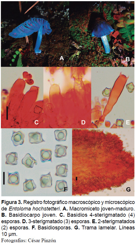 Entoloma hochstetteri (Reichardt) G. Stev., Kew Bull. 16(2): 233 (1962) Píleo: 0.8-3.0 cm de diámetro, cónico, papilado cuando joven, convexo-plano al madurar, margen incompleto o discontinuo cuando madura, superficie lisa a fibrilosa, húmeda, brillante, líneas longitudinales del centro al margen, color azul claro a oscuro, algunas zonas con gris verdoso-amarillento con tintes azules. Contexto: hasta 0.1 cm de grosor, blanco, azul claro a azul oscuro. Olor: no registrado. Sabor: fúngico, algo ácido. Lamelas: hasta 0.15 cm de grosor, anexas, algunas libres, cercanas, gruesas, concoloro con el contexto, con polvillo rosado en las aristas. Lamélulas: 2 longitudes diferentes. Estípite: 4.0-10.7 cm de longitud por 0.2-0.6 cm de grosor, central a excéntrico, cilíndrico, levemente ensanchado en la base cuando madura, superficie lisa o fibrilosa, muy frágil, color azul a blanco plateado con tintes crema hacia la base (Figura 3 A-B). Esporada: color rosado claro. Basidiosporas: 9.9-13 x 9.1-11.9 µm, cuboidales, paredes relativamente delgadas, amarillentas en KOH (Figura 3 F), inamiloides en reactivo de Melzer. Basidios: 29.4-56.6 x 10-13.7 µm, claviformes, con 2, 3 o 4 esterigmas, pared delgada, hialinos (Figura 3 C-D-E), algunos fibulados en la base. Pileipellis: un cutis, con hifas de hasta 13 μm de ancho, fibuladas, con algunos elementos terminales, algunas con pigmento intracelular granular. Trama lamelar: paralela (Figura 3G). Pseudocistidios: 4-10.4 µm de diámetro, sinuosos, ligeramente estrechos en ápice, hialinos, de pared delgada. Queilocistidios: 24-50 x 10.2-15.5 µm, cilíndricos a claviformes, hialinos o con contenido vacuolar de color café. Hábito y hábitat: solitario a gregario, sobre tierra húmeda, asociado con musgos y helechos. Uso tradicional o práctico: no registrados. Colecciones examinadas: (2 julio-2013) (JP) 6º 09’ 09,04’’ N y 73º 20’ 25,34’’ O. Finca El Rodeo, 1500 msnm (20 julio-2013) (CP) 6º 09’ 09,12’’ N y 73º 20’ 25,27’’ O. Monte del Águila, 1680 msnm. (20 julio-2013) (JP) 6º 09’ 09,04’’ N y 73º 20’ 25,34’’ O Finca El Rodeo, 1500 msnm (5 julio-2014) (CP) 6º 09’ 09,12’’ N y 73º 20’ 25,27’’ O Monte del Águila, 1580 msnm (5 julio-2014) (CP) 6º 09’ 11,84’’ N y 73º 20’ 26,04’’ O. San Antonio. 1500 msnm. Distribución: esta especie presenta amplia distribución. Se considera que la región que abarca a Malasia y Nueva Zelanda es el epicentro de dispersión (Horak 1976). Pegler (1986) registró la especie en Tailandia y Zambia, Horak (1976) lo hizo en Nueva Zelanda, Japón, Isla de Bonin, Malasia, Madagascar, Papua Nueva Guinea y Sri Lanka. El mismo autor demostró su existencia en el trópico y subtrópico. En América del Sur E. hochstetteri se reportó en Brasil (Pegler 1997, Largent y Abell-Davis 2011, Alves y Coelho 2012). En Colombia solo se reportaba en el departamento de Caquetá (Franco-Molano et al. 2005, Vasco-Palacios y Franco-Molano 2013). El presente manuscrito amplía su distribución al norte del país, en el departamento de Santander, municipio de Suaita, Olival, en bosque muy húmedo subtropical fragmentado. El área de muestreo presenta un entorno altamente impactado por actividad de tipo agrícola y ganadería, por lo que este es el primer reporte de la especie en ecosistemas de estas características. Observaciones: La descripción de las estructuras concuerda muy bien con la realizada por Alves y Coelho (2012), sin embargo, las medidas macroscópicas y microscópicas difieren de otros registros. El estípite no superó los 10.7 cm de longitud, 1.3 cm menos que el reportado por Franco-Molano et al. (2005). El tamaño del píleo no alcanzó los 3.5 cm de diámetro señalados por los mismos autores. Microscópicamente, la descripción realizada por Franco-Molano et al. (2005) registran basidiosporas con dimensiones que oscilan entre 9-11 x 8-10 µm. Horak (1976) reporta medidas entre 11-15 x 11-14 μm. Pegler (1997), con un estudio en Suramérica evidenció tamaños de 10-14 x 9-11 μm. Para el presente reporte, las esporas de E. hochstetteri son de 9.9-13 x 9.1-11.9 µm, lo que demuestra que los especímenes recolectados en Santander, Colombia difieren de lo mencionado por Horak (1976), Pegler (1997) y Franco-Molano et al. (2005). Las medidas coinciden mejor con las reportadas en Brasil por Alves y Coelho (2012), 9.75-13.75 x 9.75-12.5 μm. Los basidios no alcanzaron el diámetro reportado por Horak (1976) y Alves y Coelho (2012), 10-20 µm y 14-18 µm, respectivamente. Las dimensiones, sin embargo, no exceden el límite inferior de los mencionados por Horak (1976). El diámetro de los pseudocistidios y queilocistidios son similares a las descritas por Alves y Coelho, (2012), 6-9.2 μm de diámetro y 28-55.5 x 11-16.75 μm, respectivamente. El hábito de crecimiento reportado para el departamento de Santander difiere con el registrado en Queensland, Australia (Largent y Abell-Davis 2011) y en Caquetá, Colombia (Franco-Molano et al. 2005), citados como solitarios. El nuevo reporte presentó un hábito tipo solitario a gregario, agrupándose hasta un máximo de 3 carpoforos.