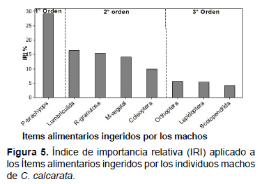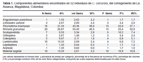 presas más ingeridas por C. calcarata. Conclusión: La especie C. calcarata se alimenta de una amplia variedad de presas.