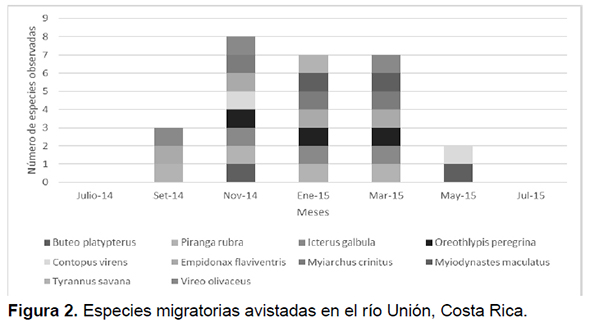 Área de estudio. El Pacífico Sur de Costa Rica es sumamente biodiverso, con un conjunto de características óptimas para que habiten muchas especies de aves (Garrigues 2007). El Valle de El General posee un clima húmedo tropical, con aproximadamente 4 meses de estacionalidad climática (Hammel et al. 2004). El río Unión, coordenadas 9°19'13"N, 83°31'01"W, se encuentra en el centro del Valle de El General, sus tributarios nacen en la Cordillera de Talamanca y desagua en el río General, con una dirección norte-sur. Tiene una longitud aproximada de 12 km, iniciando en la confluencia entre el Río San Rafael y la Quebrada Pavón a 867 msnm, en la localidad de San Rafael, hasta la confluencia con el río General, en la localidad de Santa Ana a 540 msnm. Los suelos a la orilla del río Unión han sido utilizados sobre todo para pastoreo, plantaciones de café y caña de azúcar (observación personal) (Figura 1). Lista de especies. Se siguieron los parámetros establecidos por Ralph et al. (1996) para monitoreos por puntos de radio fijo. Se escogieron 20 puntos de conteo a lo largo del río, con aproximadamente 500 m de distancia entre uno y otro, los cuales se establecieron con el software ArcMap versión 10.0. Se observó y anotó durante 10 min las especies que no habían sido vistas anteriormente. Para este estudio no se incluyeron cantos. Los avistamientos en cada punto se realizaron una vez cada dos meses entre julio de 2014 y julio de 2015, entre las 6:00 am y 10:00 am, con binoculares 8x40. En total se visitó siete veces cada punto. Cada día se muestreó un máximo de 5 puntos con más de 2 km de distancia entre uno y otro. Algunas especies que no fueron observadas en este estudio fueron reportadas por Miranda (2013). Sin embargo, la metodología utilizada por dicha autora se basó en la revisión bibliográfica de Garrigues (2007) y Stiles y Skutch (2007), por lo que no se tiene evidencia de que habiten y/o visiten la zona. En la lista se indica si la especie es residente (R) o migratoria (M). Las especies endémicas de Costa Rica y Panamá se indican como "CR-Pan", mientras que las endémicas de Nicaragua, Costa Rica y Panamá se indican como "Nic-Pan" (Tabla 1). Los datos sobre distribución y estatus migratorio se tomaron de Garrigues (2007), y algunos nombres comunes en español fueron consultados en los trabajos de Obando-Calderón et al. (2014), Sandoval (2006), y la Lista Oficial de las Aves de Costa Rica de la Asociación Ornitológica de Costa Rica (AOCR) para los nombres latinos. Además se calculó el estimador no paramétrico Jackknife 1 que se basa en el número de especies que ocurren solamente en una muestra, y se utiliza para reducir el sesgo de los valores estimados (Miller 1974). Poblaciones de M. torquata. Se consultó la metodología de Vilches et al. (2012). Se realizaron seis transectos de franja mensuales de 500 m cada uno en diferentes sitios a lo largo del río desde junio de 2013 a junio de 2015, para un total de 144 recorridos (72 km). La duración de los recorridos dependió de las condiciones del terreno (x̄=45,41 min; σ=25,99 min por recorrido). Por día se realizó un solo transecto para evitar contar más de una vez el mismo individuo. Los recorridos se llevaron a cabo entre 6:00 am y 10:00 am. Se incluyeron únicamente los individuos observados de forma directa o con binoculares 8x40 que estuvieran perchados o en vuelo. Se calculó la abundancia mediante la fórmula: P= I/D