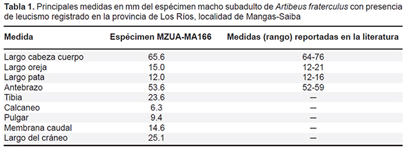 Primer reporte de leucismo para Artibeus fraterculus (Chiroptera: Phyllostomidae) en Ecuador