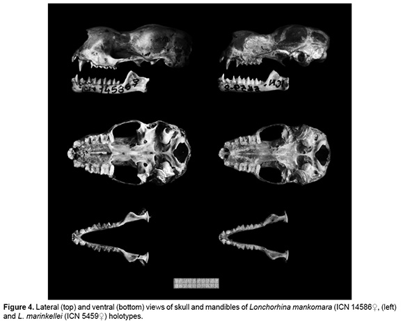Molecular data (Baker et al. 2003), place the genus Lonchorhina in its own subfamily Lonchorhininae with a deep node that probably diverged from other phyllostomids between 24.7 and 21.6 mya (Baker et al. 2012). Species in the genus Lonchorhina are characterized by extreme modifications of external characters, represented by the largest telic structures found in the family: ears, tragus, and an enormous and extremely complex sword nose-leaf, that in some species could reach one and a half the dimensions of the skull, as well as a skull morphology, only found in this genus (Hernández-Camacho and Cadena 1978). The combination of discrete skull characters in the genus is unique among phyllostomids (Hernández-Camacho and Cadena 1978). These modifications are suggested to be adaptations associated with echolocation and insect prey detection inside mature stratified forests. Lowland forests in South and Central America are interrupted by several natural barriers isolating natural populations and eventually promoting speciation. Four of the five currently recognized species in the genus (L. fernandezi, L. inusitata, L. orinocensis, and L. marinkellei) are apparently restricted to the lowland forest of Northern South America in the Amazon and Guianan biogeographic provinces (Williams and Genoways 2007 for marginal localities). The environments typically inhabited by these bats, rocky outcrops of tepuis formations, are also unique. Representatives of the genus are considered cave bats, condition which imposes extra restrictions in terms of their expansion. Natural environments of Lonchorhina, and particularly large members of the genus (L. inusitata, L. mankomara, and L. marinkellei) are, in general, difficult to access. Bats in the genus Lonchorhina are rare in museum collections and some species such as L. fernandezi are only known from its holotype, or few specimens, such as L. marinkellei (Williams and Genoways 2007) preventing a full understanding of their biogeographic patterns and morphological variation. The only species that has a wide distribution is L. aurita described from Trinidad (Tomes 1863) which exists from Oaxaca, México south to South East Brazil, Bolivia, Perú and Ecuador; Trinidad and the New Providence Islands (Bahamas Islands) (Jones and Carter 1976). Lonchorhina aurita is currently considered a monotypic species (Williams and Genoways 2007). However, Anthony (1923) described the subspecies L. a. occidentalis based on three specimens collected in Guayas, Ecuador. Currently, L. a. occidentalis is considered as a junior synonym of L. aurita since Cabrera (1958) overlooked this taxon in his revision of mammals from South America. Nevertheless, Linares and Naranjo (1973) and Hernández-Camacho and Cadena (1978) suggested that L. a. occidentalis should be treated as a subspecies of L. aurita until additional material will be available to test its specific status. Unfortunately, Anthony (1923) did not provide a description of discrete skull characters to differentiate L. aurita from Guayas from its conspecific from Trinidad, and the author refer to the skull of L. a. occidentalis as “normal for the genus Lonchorhina, and very similar to that of L. aurita”, line that constitutes the only reference for skull morphology in Anthony’s (1923) description of the species. Although large skull L. inusitata is “similar to L. marinkellei in shape of the rostrum, there are differences in skull size. In L. inusistata the basisphenoid pits are shallow anteriorly contrasting the anteriorly deep basisphenoid pits of L. marinkellei. These two species also differ in shape and degree of hairiness of ears, noseleaf, and facial excrescences; underparts of L. inusitata are dark, while in L. marinkellei the venter is heavily washed (Williams and Genoways 2007). The same authors mentioned that the rostrum in L. marinkellei is higher than the braincase, while in L. inusitata the rostrum is about of equal height or slightly lower than the braincase.” Many specimens of L. inusitata have been either misidentified with the smaller and more common L. aurita (Genoways et al. 1981) (material from Suriname), or with the much larger and less common L. marinkellei (Brosset and Charles-Dominique 1991, Brosset et al. 1996) (material from French Guiana). The combination of discrete skull characters of L. mankomara holotype are unique among recognized species of Lonchorhina and represent a significant morphological evolution of characters historically assumed as conserved among mammals such as modifications in size and placement of dental elements. Biogeography. The morphological variation observed in our new species in conjunction with the geographic location of the holotype open a series of interesting questions about the biogeography of the genus. The Guayana Region is a discontinuous biogeographical area, formed by the rock outcrops of the Guayana Shield, one the oldest geological formation of South America. This formation of Precambrian origin is located in northern South America and spans close to two million square kilometers. However, outcrops of this formation are of insular character and form a complex landscape of lowland, upland and highland ecosystems (Gröger and Huber 2007), surrounded by tropical forest or savannas. Such a discontinuous arch of inselbergs (lowlands, about 300-500 masl) hills (uplands, >500 masl), and tepuyes (highlands, >3000 masl) form insular habitats with a highly endemic biota. The Guayana region has been subdivided into four major provinces: Eastern, Central, Pantepui, and Western (where Chiribiquete is located) (Huber 1994, Berry et al. 1995). The Western Guianan Province is represented by a mosaic of forests of Amazon and Guianan elements, hills and isolated mountain ranges, and savannas located between the Rivers Guaviare and Caquetá (Cortes and Franco1997). Hernández-Camacho et al. (1992) recognized the area of Chiribiquete as part of the “Complejo Vaupés”