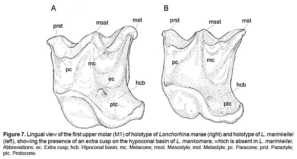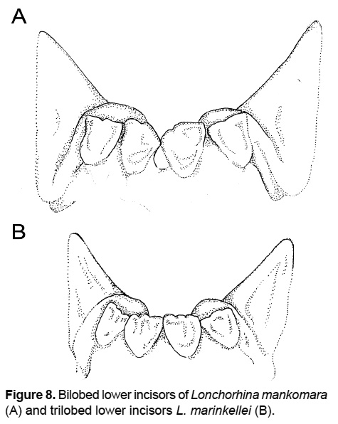 Dental characters. Lonchorhina mankomara has an overall more massive dentition than L. marinkellei; enlarged first premolar double the size of that in L. marinkellei; wide molars with elongated lingual bases; holotype of L. mankomara has an extra cusp on the hypoconal basin of the first and second upper molars, absent in other specimens of the type series and representatives of the other species in the genus (Figure 7). Lower incisors bilobed, contrasting the trilobed incisors of L. inusitata and L. marinkellei (Figure 8). Description. Largest species in the genus (Table 1); noseleaf enormously developed (0.9 to 1.49 the length of the skull; width 1/3 of the length of the skull) free margins not crenulated or waved, revoluted on the anterior surface of its base accompanied with ribs (costae foliae nasalis), and a medial costae on both the anterior and posterior surfaces of the noseleaf, formed by two muscular bands (sulcus medialis costae), absent in L. orinocensis. Presence of two nasal fossae (vestibule narium) separated by a septum (connectivum sellae), which in its posterior parts extends into the sella. The sella is constituted by the basis sellae, expanded anteriorly and laterally to form two mobile laminar expansions (alae sellae), on top of which the sellae is thinner forming the pedumculum sellae which is terminated in tuberculum sellae. On each side, the basal portion of the noseleaf is extended forming a plica praenarialis, which is extended to the basis sellae delimiting the vestibule narium. The narina are narrow and opened upwards inside the vestibuli close to a conspicuous excrescence (cornu praenariale major) of the plica praenarialis; lateral to that excrescence there is a second one, smaller in size (cornu praenariale minimus). All described ornamentations are absent in L. ferenandezi. In L. mankomara all ornamentations are enlarged compared to those in other species in particular the pedumculum sellae is longer and the tuberculum sellae is more expanded and simple than that of L. marinkellei. A representation of the ornamentations of noseleaf of L. mankomara and structure´s nomenclature used (Hernández-Camacho and Cadena 1978) is presented in Figure 9. Lonchorhina mankomara holotype has a dorsal pelage bicolored, white at the base and axial two thirds sepia 219 (Smithe 1975) (Figure 10); contrasting the unicolored amber 36 (Smithe 1975) dorsal pelage of L. marinkellei holotype. Dense and longer bicolored hair on the chest, olive brown 28 (Smithe 1975) at the base and drab 27 (Smithe 1975) on the tips; contrasting the shorter hair cinnamon brown 33 (Smithe 1975) at the base and drab 27 (Smithe 1975) on the tips of L. marinkellei holotype. In L. mankomara, there are long hairs (14.55 mm) extended laterally on the chest, that can be observed ventrally, absent in L. marinkellei holotype. Dense and long facial and ear hairs (>6.9 mm at the base of the ear) contrasting the shorter hair of L. marinkellei holotype. Membranes are black to dark brown. Holotype of L. mankomara has a dense pillow of short hairs on the anterior margins of the ear pinna; structure that may prevent the friction between the noseleaf and the pinna, also present in other representatives of the genus, as well as other long eared bats such as some representatives of Micronycteris (Simmons et al. 2000). Skull characters. Large and elongated skull compared with skulls in other species of the genus. Braincase height same as rostrum height (subequal) (character shared with L. inusitata and L. marinkellei); nasal aperture broad and piriform, compared to the narrow nasal aperture of L. marinkellei; wide rostrum; projections of palatine swollen; massive hamulus pterigoideus; angled occipital region observed from a ventral view. Dental characters. Dental formula: I 2/2; C1/1; PM; 2/3; M3/3. Lonchorhina mankomara has an overall more massive dentition than L. marinkellei; central upper incisors longer and wider; massive canines with a wide cingula; enlarged first upper premolar, double the size of that in L. marinkellei (Figure 4) wide molars with elongated lingual bases; presence of an extra cusp on the hypoconal basin of the first and second upper molars (Figure 7); bilobed lower incisors (Figure 8b).