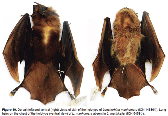 FAMILY PHYLLOSTOMIDAE Subfamily Lonchorhininae, Baker et al. 2003 Genus Lonchorhina Tomes 1863 Lonchorhina mankomara sp. nov. Lonchorhina marinkellei (Montenegro and Romero 2000)v6n2a10f1.jpg Lonchorhina marinkellei (Marín-Vasquéz and Aguilar-González 2005) Lonchorhina marinkellei (Mantilla-Meluk et al. 2009) Type locality. Río Mesay, Puerto Abeja (Tepui), Southeastern portion of Serranía de Chiribiquete The National Park Chiribiquete (PNN Chiribiquete), at 340 masl, department of Caquetá, Colombia; coordinates: 00°04´N, 72°26´W (Figure 1). The PNN Chiribiquete, corresponds to one of the most pristine and unexplored areas in the country, enclosing the oldest and largest series of Amazon pictograms (20.000 years bc) registered on the outcrops of the numerous inselbergs and tepuis, in which images of bats are of particular cultural importance. Type series. Three adult females collected at the same locality of the holotype on different days were included in the type series: ICN 14584♀, collected by O. Montenegro (collectors number OMD 138) on July 10, 1993; preserved as skin, skull extracted, partially damaged; nasals and basicranium broken; ICN 14585♀, O. Montenegro (collectors number: OMD 173) on July 12, 1993; preserved as skin, skull extracted in good condition; ICN 14587♀, collected by O. Montenegro (collectors number OMD 169) on 20 of July, 1993; preserved as skin, skull extracted in good condition at the moment of the description, but accidentally destroyed during the plague control process of the collection of the ICN (Figure 5). Distribution. Lonchorhina mankomara is only known from the type locality, and presumably confined to the lowland rocky outcrops of the PNN Chiribiquete, at department of Caquetá, in Colombia (Figure 1) Such lowland outcrops (also called inselbergs) belong to the Guayana Region, the recognized biogeographical entity assigned to the outcrops of the Guayana Shield (Maguire 1979, Huber 1994, Berry et al. 1995). Etymology. The name mankomara is composed of two parts; the first refers to the indigenous Karijona word manko (ma-nü-ko), meaning mother. Karijona or Carijona is an indigenous culture that inhabited the area of Chiribiquete and were virtually extinct after the genocide of indigenous people promoted by the rubber trading. Karijonas are currently represented by no more than 350 survivors that lost their own language. We wanted to honor Karijonas as documenters of the nature of Chiribiquete. The new species is named after Mara Meluk de Mantilla, mother of the senior author. My mother always encourage me to appreciate the wonders of nature and to appreciate cultural diversity. The name is also an extended recognition to all mothers, that have play the role of being keepers of knowledge and to promote curiosity and science in our societies. Diagnosis. The largest species known in the genus Lonchorhina (holotype: FA=64.1 mm; GSL=27.62 mm), closely related to L. marinkellei (Table 1). Telic structures enormously developed. Long noseleaf broad at the base (noseleaf length 40.15 mm; width at noseleaf base 12.2 mm) compared with L. marinkellei noseleaf (37 and 11.32 mm respectively), ear pinna (44.86 mm from notch), and tragus (22.3 mm). Skull characters. Skull larger than in other species of the genus (GSL>26.5); height of the braincase almost the same size of the rostrum; sagittal crest present, absent in L. marinkellei; in L. mankomara, the observed area of the basisphenoid from a ventral view has a rectangular appearance, longer than wider (width representing a 66% of its length), with the lateral sides concave (lateral sides delimited by the medial pterigoid plates); while in L. marinkellei the structure looks almost squared (width representing 86% of its length) and lateral sides convex (Figure 6). v6n2a10t1.jpg