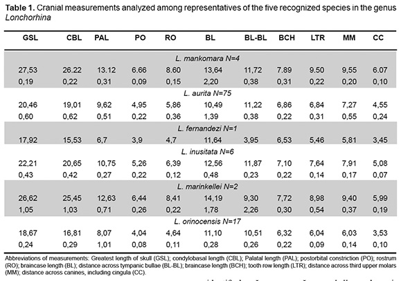 Analysis of discrete characters. Phenetic affinities of divergent Lonchorhina specimens from Serranía de Chiribiqute were evaluated through comparative analyses of discrete characters with respect to 105 Lonchorhina specimens representing the five recognized species in the genus from a substantial portion of its distribution. Our morphological analyses comprise the largest dataset of specimens used in a single publication for this genus and included comparisons with the holotype of L. marinkellei (ICN 5459♂) and material of this species from near the type locality in Mitú, department of Vaupés, Colombia; as well as material of L. aurita from Trinidad, collected near the type locality of the species; specimens from several localities across its distributional range (Belize, Honduras, Panamá, Colombia, Venezuela, Perú and Brazil); images of the holotype of L. a. occidentalis (Ecuador); specimens of L. inusitata from Brazil and Venezuela; a specimen of the rare L. fernadezi from the only known collecting locality of the species in Venezuela; and representatives of L. orinocensis from several localities in Colombia and Venezuela (Appendix I). Although resolving the phylogeny of the genus is beyond the scope of this work, since we were able to include all currently recognized species in the genus in our dataset, we wanted to present a preliminar evaluation of the phylogenetic affinities of Lonchorhina species. Seventeen discrete external and cranial characters were evaluated and codified for all recognized species in the genus (L. fernandezi, L. orinocensis, L. aurita, L. inusitata, L. marinkellei, and L. sp. nov.) (matrix of characters presented in Appendix II) and a cladistic analysis was performed using the maximum parsimony and bootstrap search option of Winclada (Nixon 1999) and NONA 2.0 (Goloboff et al. 2008); and using Micronycteris hirsuta as outgroup. In all analyses, 10.000 replicates were performed. To guarantee independence among characters morphometric data were excluded from the analysis. We report only the most parsimonious tree. Morphometric analysis. The morphometric variation of divergent specimens from the PNN Chiribiquete, were also evaluated through a principal components analysis (PCA) performed on 10 cranial measurements including: greatest skull length (GSL); condylobasal length (CBL); palatal length (PAL); postorbital constriction width (PO); rostrum width (RW); braincase height (BCH); distance across tympanic bullae (BL-BL); tooth row length (TR); distance across third upper molars (M-M); distance across canines including cingula (C-C) of 105 Lonchorhina specimens from eight countries including all recognized species in the genus from most of its known geographic range from Belize to Brazil. Only adult specimens were used in the analyses and age was determined based on the presence of closed epiphyses. All measurements are in millimeters to 0.01 mm and were tested for normality and homogeneity of variances using a Shapiro-Wilks and a Bartlett’s tests respectively. Measurements are summarized in Table 1. Analyzed specimens are deposited at the following institutions: Field Museum of Natural History (FMNH); National Museum of Natural History of the Smithsonian Institution (USNM); Instituto de Ciencias Naturales of the Universidad Nacional de Colombia (ICN); and the Natural Science Research Laboratory of the Texas Tech Museum (TTU). Specimens included in the analysis and collecting localities are compiled in Appendix I. Hypothesis testing. To test our hypothesis of a morphometric differentiation between our samples from Serranía de Chiribiquete and large representatives in the genus (L. inusitata and L. marinkellei) a Discriminant Function Analysis (DFA) was performed on the ten recorded cranial measurements in the statistical package Statistica Centurion XV.