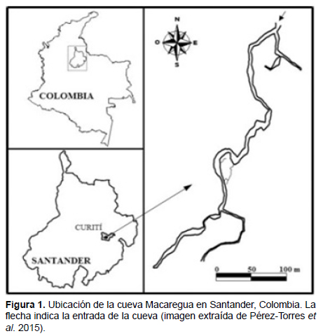 La cueva Macaregua (06º 39’ 39.2’’ N 73º 0.6’ 29.4’’ W, de 1.565 metros de elevación) se encuentra en el municipio de Curití, en la vereda Las Vueltas, departamento de Santander, Colombia (Figura 1). Cuenta con una temporada seca (de noviembre a marzo) y una húmeda (abril a octubre) (Colmenares 2008). La vegetación que rodea la entrada de la cueva es bosque seco tropical caracterizada sobre todo por especies de las familias Boraginaceae, Fabaceae, Myrsinaceae, Rubiaceae y Caesalpiniaceae (Pérez-Torres et al. 2015). Esta cueva se encuentra reconocida como un sitio importante para la conservación de murciélagos (SICOM) desde el año 2014. La cueva cuenta con dos galerías principales, una de estas es seca y tiene aproximadamente 80 metros de largo, la otra presenta una corriente de agua con una longitud aproximada de 610 metros de largo (Pérez-Torres et al. 2015). La altura media de la cueva es de 3,2 m con algunas secciones que alcanzan los 6 m (Pérez-Torres et al. 2015). La temperatura al interior de la cueva varía entre 21°C y 28˚C, con una humedad relativa entre 70% y 80% (Pérez-Torres et al. 2015). En la cueva se han identificado diez especies de murciélagos: Desmodus rotundus, Carollia perspicillata, Micronycteris schmidtorum, Micronycteris megalotis, Glossophaga soricina, Anoura caudifer y Dermanura bogotensis dentro de Phyllostomidae; Myotis nigricans, dentro de Vespertilionidae; Natalus tumidirostris, dentro de Natalidae; y Mormoops megalophylla, dentro de Mormoopidae (Pérez-Torres et al. 2015, Rueda-Ardila y Pérez-Torres 2016). Esta información indica que la cueva Macaregua posee la comunidad de murciélagos con mayor riqueza de cualquier cueva en Colombia (Pérez-Torres et al. 2015). De igual forma, se ha reportado presencia de Histoplasma capsulatum (Grose y Marinkelle 1970) lo que ha hecho que no sea muy frecuentada por turistas. Se realizaron dos salidas de campo. La primera salida tuvo lugar en el mes de marzo de 2010 con una duración de una semana; en esta salida no se realizaron capturas, el objetivo principal fue identificar y marcar con banderas en el suelo los puntos de ubicación de los diferentes grupos de Carollia perspicillata. Esto se realizó con el objetivo de ver diferencias en la ubicación y el número de grupos con respecto a la segunda salida, cuatro meses después. La segunda salida, tuvo una duración de un mes y consistió en la caracterización de las agrupaciones de Carollia perspicillata observadas y marcadas antes. Los grupos se capturaron de los sitios de percha del techo de la cueva durante el día usando una trampa de balde, modificada de la propuesta por McCracken y Bradbury (1981). Esta trampa consistió en un balde plástico de alrededor 40 cm de diámetro por 60 cm de profundidad con el fondo abierto y una bolsa de tela de 50 cm de profundidad fijada en su posición, la boca del balde era lo suficientemente grande para rodear una agrupación entera de murciélagos y la bolsa constaba de una cremallera lateral y un cordón que la cerraba en la parte superior para evitar que los murciélagos escaparan cuando estos caían en la bols; la trampa estaba sujeta a dos varas metálicas (aproximadamente de 3 m) que permitían alcanzar una altura de 3,7 m del techo de la cueva. A los murciélagos capturados se les registraron sus medidas morfométricas estándar (LT, LC, LP, LO y AB), peso y sexo (Simmons y Voss 1998, Sikes et al. 2016). La edad relativa de los individuos se calculó a partir de la osificación de la falange (Costa et al. 2007) y la condición reproductiva se evaluó a partir de la posición de los testículos en los machos, por la condición de los pezones (pezón evidente, alopécico o lactante) y preñez en las hembras, este último se determinó a partir de palpación abdominal (incipiente, intermedio y avanzado). Se identificó el tipo de percha en que estaban presentes los individuos de acuerdo con la clasificación de Peñuela-Salgado y Pérez-Torres (2015). Los murciélagos se marcaron con un tatuaje en el mesopatagio indicando una numeración consecutiva. Resultados