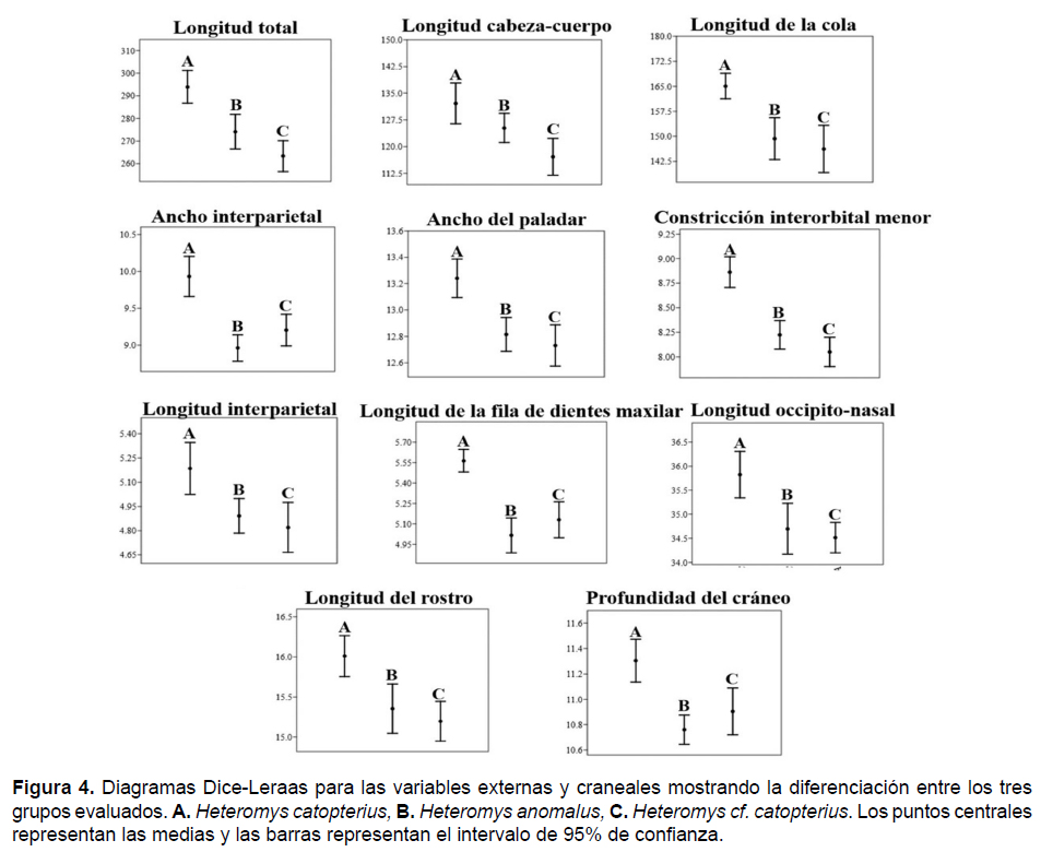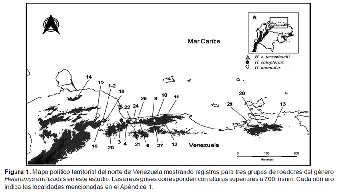 Especímenes y gacetillas de las localidades (según catálogos de museos), en este trabajo Heteromys c. terzenbachi (n=28). 1. La Trampa del Tigre (1400-1940 msnm; 10°25’ N, 68°48’ O), Sector El Silencio, Parque Nacional Yurubí, Sierra de Aroa, Estado Yaracuy (MZUC-692, 696, 697, 703, 706, 711, 712, 713, 715, 716, 717, 718, 719, 720, 721, 878, 879, 1092, 1503, 1533; EBRG-29657, 29667, 29668, 29669, 29670, 29671, 29672). 2. Quebrada Palo Verde (883 msnm; 10° 26’ 02” N, 68° 48’ 18” O), sector El Tigre, Parque Nacional Yurubí, Sierra de Aroa, Estado Yaracuy (MZUC-692). Heteromys catopterius (n = 32). 3. Campamento La Justa (350 msnm; 10° 23’ N, 68° 14’ O), río Morón, Estado Carabobo (EBRG-17109). 4. Parque Nacional San Esteban, Cariaprima (1025 msnm; 10° 22’ N, 68° 02’ O), Estado Carabobo (EBRG-22006). 5. Estación Biológica Rancho Grande-Cata, Kilómetros 24-29 (680 msnm; 10° 22’ N, 67° 44’ O), Estado Aragua (EBRG-28205, 28206). 6. Cerca del refugio Pico Guacamaya (1730 msnm; 10° 22’ N, 67° 40’ O), Parque Nacional Henri Pittier, Estado Aragua (EBRG-28216, 28221): incluye, La cumbre, Estación Biológica de Rancho Grande (1500 msnm), Parque Nacional Henri Pittier (EBRG-190, 4317, 28222); Cerca del pluviómetro de Andy Field, Parque Nacional Henri Pittier (1690 msnm) (EBRG-28213). 7. Portachuelo (1100-1120 msnm; 10° 21’ N, 67° 41’ O), Parque Nacional Henri Pittier, Estado Aragua: incluye, Parque Nacional Henri Pittier, Estación Biológica de Rancho Grande, sendero La Toma (EBRG-32, 362, 363, 26991, 26993, 26995, 26996, 27353, 28203, 28223). 8. Vía Ocumare de la Costa (630 msnm; 10° 22’ N, 67° 44’ O), Parque Nacional Henri Pittier, Estado Aragua (EBRG-28218). 9. Monumento Natural Pico Codazzi (1600-2000 msnm; 10° 25’ N, 67° 17’ O), Colonia Tovar, Estado Aragua (EBRG-21736, MZUC-842, 843). 10. 5 Km S, 23-25 Km O de Caracas, Alto Ñeo León (1870-1880 msnm; 10° 26’ N, 67° 09’ O), Parque Nacional Macarao, Distrito Capital (EBRG-15083, 15084). 11. 9.4 Km al Norte de Caracas, Hotel Humboldt (10° 33’ N, 66° 52’ O), Parque Nacional Waraira Repano (El Ávila), Distrito Capital (EBRG-15052, 15053, 15054, 15056). 12. Estación Experimental El Laurel (1355 msnm; 10° 23’ N, 66° 54’ O), carretera Hoyo La Puerta, Estado Miranda (EBRG-22259). 13. 2 Km N, 4 Km O de Caripe (1170 msnm; 10° 11’ N, 63° 32’ O), cerca de San Agustín, Estado Monagas (EBRG-15086). Heteromys anomalus (n = 57). 14. Serranía de San Luis, Parque Nacional Juan Crisóstomo Falcón, sector Cumbre de Uría (1320-1370 msnm; 11° 13’ 32” N, 69° 36’ 50” O), 9 Km N de Cabure, Estado Falcón (EBRG-25312, 25314, 25315): incluye, Serranía de San Luis, Parque Nacional Juan Crisóstomo Falcón, 10 Km O + 4 Km N de Cabure, sector Cerro Galicia (EBRG-23103, 25311); Parque Nacional Juan Crisóstomo Falcón, El Haitón, municipio Petit (EBRG-23487, 23488). 15. Finca El Jaguar (800 msnm; 10° 32’ N, 68° 59’ O), 16 Km NO de Aroa, Sierra de Bobare, Estado Yaracuy (EBRG-18903, 20699, 21750, 22344). 16. El Balcón de Yaracuy (1500 msnm; 10°20’48,7”N, 68°50’05,3”O), sector Pitigüao, Sierra de Aroa, Estado Yaracuy (EBRG-29735). 17. Hacienda el Zinc (1223 msnm; 10°19’22” N, 68°51’07” O), Sierra de Aroa, municipio Sucre, Estado Yaracuy (EBRG-29414, 29415, 29416, 29417, 29418, 29436). 18. El descansadero del tigre (213 msnm; 10° 26’ N, 68° 40’ O), sector Mayorica, Parque Nacional Yurubí, Sierra de Aroa, Estado Yaracuy (EBRG-29630, 29631; MZUC-398, 399): incluye, Mayorica, pica hacia Guayabito, Parque Nacional Yurubí, Sierra de Aroa (MZUC-1127). 19. Cuenca de Las Minas (700 msnm; 10° 22’ N, 68° 52’ O), sector Los Bacos, Sierra de Aroa, Estado Yaracuy (EBRG-23621). 20. Cerro Zapatero (1227 msnm; 10° 13’ 82” N, 68° 38’ 28” O), Macizo de Nirgua, Estado Yaracuy (MZUC-693). 21. Finca Cujigacho (500 msnm; 10° 14’ N, 67° 52’ O), Guacara, Estado Carabobo (EBRG-28173). 22. Fila La Josefina (1350 msnm; 10° 20’ N, 67° 55’ O), 11 Km NO de Tronconero, Parque Nacional San Esteban, Estado Carabobo (EBRG-10146, 10174, 10202). 23. Hacienda Saint Jean (120 msnm; 10° 26’ 00” N, 67° 58’ 00” O), 13 Km SE de Borburata, Estado Carabobo (EBRG-8167, 8186). 24. Quebrada Yapascua (0-100 msnm; 10° 23’ 00”N, 67° 53’ 00” O), bosque de galería Yapascua, Parque Nacional San Esteban, Estado Carabobo (EBRG-8171, 8193). 25. El Limón, Estación de Fauna (450 msnm; 10° 19’ N, 67° 39’ O), Parque Nacional Henri Pittier, Estado Aragua (EBRG-131, 133, 27354): incluye, Parque Nacional Henri Pittier, cumbre Turiamo (EBRG-359, 360); Estación de Piscicultura del Ministerio de Agricultura y Cría, El Limón, Maracay, (EBRG-188, 28171); Estación Biológica de Rancho Grande, Cata, Km 36, Parque Nacional Henri Pittier (EBRG-28184, 28186); La Trilla, Parque Nacional Henri Pittier (EBRG-28185, 28192); Parque Nacional Henri Pittier, 4.6 Km. S de Rancho Grande por carretera (EBRG-16955); Parque Nacional Henri Pittier, Estación Biológica de Rancho Grande (EBRG-15047, 15048, 15049). 26. Carretera Rancho Grande-Ocumare (250-500 msnm; 10° 23’N, 67° 45’ O), Parque Nacional Henri Pittier, Estado Aragua (EBRG-28178, 28179, 28180, 28181, 28182, 28187). 27. Parque Nacional Macarao, Cerro Geremba (2337 msnm; 10° 24’ 37.4” N, 67° 12’ 42.2” O), Estado Miranda (EBRG-27461). 28. Quebrada Yoraco (400 msnm; 10° 12’ N, 63° 55’ O), cerca de Las Trincheras, base Turimiquire, Estado Sucre (EBRG-8196). 29. Río Neverí (450 msnm; 10° 20’ 17” N, 64° 17’ 56” O), Parque Nacional Mochima, Paraminal, municipio Raúl Leoni, Estado Sucre (EBRG-23021). Apéndice 2