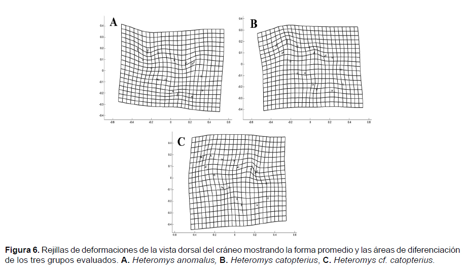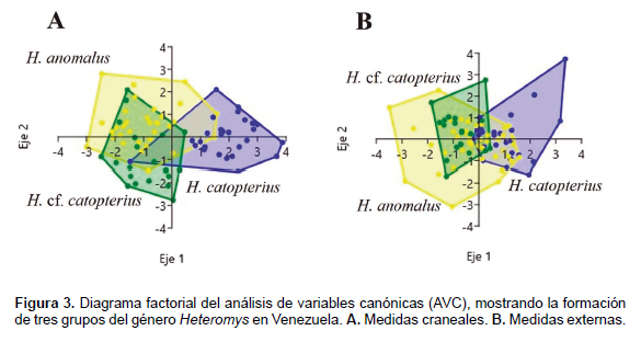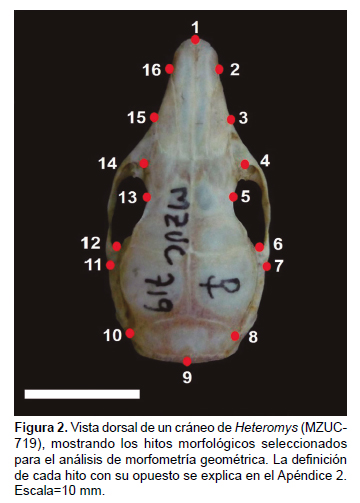 Se revisaron 117 especímenes adultos de Heteromys (clases de edad IV-VI, Rogers and Schmidly 1982, Apéndice 1), de las especies H. anomalus, H. catopterius y H. cf. catopterius. Las muestras fueron agrupadas geográficamente, tomando en consideración la procedencia de las mismas: cordillera de la Costa: tramos occidental (sierras de Bobare y de Aroa), central (serranía del Litoral) y oriental (serranía de Turimiquire), y sistemas de colinas Lara-Falcón: sierra de San Luis (Figura 1). Para los análisis de morfometría lineal y geométrica, se trabajó sólo con adultos de la clase de edad IV. Este criterio de edad se sustentó en que es la clase más representativa de las muestras de la sierra de Aroa y la más abundante entre las muestras de adultos de poblaciones habitantes de las ordilleras de la Costa Central y Oriental, disponibles en colecciones de historia natural en Venezuela (Anderson y Gutiérrez 2009). Se siguió la consideración de Anderson y Gutiérrez (2009), de la no existencia de dimorfismo sexual para las diferentes poblaciones de Heteromys; por lo tanto, machos y hembras se agruparon para los análisis estadísticos y de comparación. Las medidas craneales utilizadas para identificar las variaciones en los tres grupos evaluados fueron las siguientes: longitud occipital-nasal (LON), ancho del arco cigomático (AC), longitud del rostro (LR), longitud de los nasales (LN), constricción interorbital menor (CIM), ancho del escamoso (AE), longitud de la fila de dientes maxilar (LFM), ancho parietal (AP), ancho interparietal (AIP), longitud interparietal (LIP) y profundidad del cráneo (PC). Las medidas externas se tomaron de las etiquetas de los especímenes o de las bases de datos suministradas por los museos e incluyeron la longitud total (LT), longitud cabeza-cuerpo (LCC), determinada restando la longitud de la cola de la total, longitud de la cola (LC), longitud de la pata posterior (LP) y longitud de la oreja (LO). Todas las medidas fueron tomadas con un calibrador digital y representadas en mm con una precisión de 0.01 mm. Para la selección y definición de las medidas se siguió a Anderson y Gutiérrez (2009). Se realizó un análisis de variables canónicas (AVC), para identificar la posible diferenciación entre los tres grupos estudiados. Un análisis de varianza multivariado (MANOVA), permitió analizar las diferencias significativas entre los grupos en función de todas las medidas craneales y externas, con comparación posterior entre pares basada en la distancia de Mahalanobis (dij). Luego se realizaron análisis ANOVA para cada una de las medidas craneales y externas. Los criterios que se tomaron en cuenta para los análisis de morfometría geométrica siguieron a García y Sánchez-González (2013). Se seleccionó sólo la vista dorsal de cada cráneo [H. cf. catopterius (n=20), H. catopterius (n=26) y H. anomalus (n=16)], y las fotografías fueron realizadas por la misma persona con ayuda de un trípode. Debajo de cada cráneo se colocó un papel milimetrado para obtener una foto con la escala de referencia. Se eligieron 16 hitos morfológicos, utilizando el programa TPSdig (Rohlf 2006). La escogencia de los hitos (Figura 2), estuvo basada en áreas del cráneo consideradas como caracteres taxonómicos del grupo (Anderson y Gutiérrez 2009). Los hitos morfológicos generaron dos ejes de coordenadas (x, y), que representaron las configuraciones geométricas de cada cráneo. Cada uno de esos ejes fue sometido a un ajuste de Procrustes, donde se eliminó la variación asociada con los efectos de posición, orientación y escala. Los residuos del ajuste de Procrustes generaron dos matrices: una matriz (desviaciones parciales), se empleó para realizar el análisis de variables canónicas (AVC/MANOVA), en la cual se asignaron grupos a priori definidos como H. cf. catopterius, H. catopterius y H. anomalus, se calcularon las distancias de Mahalanobis y se obtuvo el porcentaje de los grupos reclasificados. La otra matriz se utilizó para documentar el tamaño centroide, el cual se obtuvo al calcular la raíz cuadrada de la suma de las distancias, elevadas al cuadrado desde cada hito morfológico al centroide. Finalmente, para observar los cambios de la forma en las diferentes áreas o regiones de los cráneos sobre el espacio del AVC, se empleó la función de interpolación de placas de deformación, utilizando el tamaño centroide como un estimador y obteniéndose una representación visual (rejilla de deformación), de las diferencias en la forma, con respecto a la configuración promedio. Los análisis estadísticos y de morfometría fueron realizados con los programas CoordGen, CVAGen (Sheets 2005a, b), MOG (Dujardin 2005) y PAST (Hammer y Harper 2011). Todo el material examinado, se encuentra disponible en las siguientes colecciones venezolanas: Museo de la Estación Biológica de Rancho Grande (EBRG, Aragua) y Laboratorio Museo de Zoología de la Universidad de Carabobo (MZUC, Carabobo).