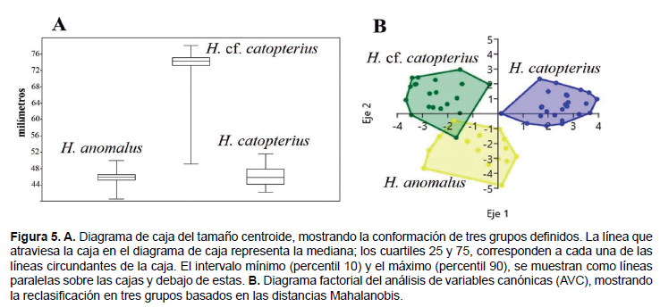 El AVC para las medidas craneales (Figura 3A), muestra un agrupamiento concordante en 80% para H. anomalus (24 individuos de 30), 63,6% para H. cf. catopterius (14 individuos de 22) y 92,9% para H. catopterius (26 individuos de 28). En cuanto a las medidas externas (Figura 3B), la reclasificación concordó en 51,5% para H. anomalus (17 individuos de 33), 38,7% para H. cf. catopterius (12 individuos de 31) y 58,1% para H. catopterius (18 individuos de 31). El MANOVA para las medidas craneales, mostró diferencias significativas entre los grupos (λ de Wilks=0,26; F=5,84; p<0,001 con g.l1 y 2=22 y 134), arrojando en la comparación de pares basada en la distancia de Mahalanobis, diferencias significativas en las medidas craneales de H. catopterius y H. cf. catopterius (dij=8,95; p<0,001) y entre H. catopterius y H. anomalus (dij=8,48; p< 0,001). Las medidas externas arrojaron resultados que sustentan las mismas diferencias entre grupos (λ de Wilks=0,67; F=4; p<0,001 con g.l1 y 2=10 y 174), con diferencias en las medidas externas entre H. catopterius y H. cf. catopterius (dij=2,98; p<0,001) y entre H. catopterius y H. anomalus (dij=1,57; p<0,001). Las medidas que discriminaron a los tres grupos (Figura 4), según la prueba de ANOVA fueron tres externas (2 y 92 g.l entre/intra grupos): LT (F=11,78; p<0,001); LCC (F=6,58; p=0,002); LC (F=8,63; p<0,001) y ocho craneales (2 y 77 g.l entre/intra grupos): LON (F=7,68; p=0,001); LR (F=8,32; p<0,001); CIM (F=28,20; p<0.001); LFMD (F=24,19; p<0,001); AIP (F=29,97; p<0,001); LIP (F=7,10; p=0,001); AP (F=13,67; p<0,001); PC (F=14,21; p<0,001). En promedio, H. cf. catopterius, obtuvo valores menores que los otros grupos en las medidas externas y en la mayoría de las medidas craneales, que son significativamente diferentes a las medidas de H. catopterius (Tabla 1). En relación con la morfometría geométrica, hubo diferencias estadísticamente significativas en el tamaño centroide entre los tres grupos (Figura 5A). H. cf. catopterius, obtuvo un tamaño centroide mayor que el resto de los grupos evaluados (X =72,92; mm±1,45), seguido por H. catopterius (X=46,01 mm±0,47; p<0,001) y H. anomalus (X=45,66; mm±0,37; p<0,001). En cuanto a la variación de la forma del cráneo en la vista dorsal, el AVC reveló que la reclasificación de las muestras concordó en 93,8% para H. anomalus (15 individuos de 16), 95% para H. cf. catopterius (19 individuos de 20) y 100% para H. catopterius (30 individuos de 30). El diagrama factorial del AVC (Figura 5B), mostró una separación de los tres grupos más precisa que la obtenida por la morfometría tradicional (Figura 3). Sin embargo, el análisis MANOVA posterior para la matriz de morfometría, concuerda con lo encontrado en la comparación por medidas craneales y externas, con una diferencia entre grupos (λ de Wilks=0,06; F=4,27; p<0,001 con g.l1 y 2=58 y 62 ), que se muestra sólo entre H. catopterius y H. cf. catopterius (dij=23,77; p=0,041) y entre H. catopterius y H. anomalus (dij=18,38; p=0,027), siendo no significativas para H. anomalus y H. cf. catopterius (dij=16,14; p=0,283). Las rejillas de deformaciones señalan las diferencias en las áreas del cráneo de la vista dorsal (Figura 6). En H. anomalus se estrecharon los nasales (hitos 2 y 16) y los frontales en la zona media (hitos 6 y 12), mientras que se expandió la caja cefálica (hitos 7 y 11). En H. catopterius se estrecharon ligeramente los frontales en la zona media (hitos 6 y 12), mientras se expandieron los nasales (hitos 2 y 16) y la región interorbital (hitos 5 y 13). En H. cf. catopterius, hubo una marcada estrechez en la región interorbital (hitos 5 y 13) y caja cefálica (hitos 7 y 11); una ligera estrechez en la parte media de los frontales (hitos 6 y 12), mientras que se expandieron ligeramente los nasales (hitos 2 y 16) y la zona anterior de los frontales (hitos 4 y 14). En cuanto a los patrones de coloración (Figura 7), las poblaciones de H. cf. catopterius de la Sierra de Aroa, poseen una coloración similar a las poblaciones de H. catopterius de la serranía del litoral y cordillera Oriental, pero difieren de la coloración típica de H. anomalus. Las diferencias relacionadas con el cráneo se limitan al tamaño y proporción. Los cráneos de las poblaciones de H. cf. catopterius de la sierra de Aroa son más pequeños y menos robustos cuando se compararon con individuos de H. catopterius de la serranía del Litoral y cordillera Oriental y son similares a los cráneos de H. anomalus (Figura 7). La evidencia métrica y geométrica en conjunto con los patrones de coloración y morfología externa-craneal soporta el reconocimiento de un nuevo taxón (a nivel de subespecie), habitante de las áreas montañosas del tramo occidental de la Cordillera de la Costa, el cual se describe a continuación: Heteromys catopterius terzenbachi ssp. nov. Ratón mochilero de Terzenbach (Terzenbach’s Spiny pocket mouse) (Figuras 7 D y E; 8 B; 9 A, B y C; 10) Holotipo. Hembra (MZUC–878; clase de edad IV), preservada como piel, cráneo (Figuras 7 D y E; 9 A, B y C) y esqueleto post-craneal, colectada por Franger J. García y Mariana Isabel Delgado-Jaramillo (número de campo: FG-1844), el 22 de mayo de 2009 en un bosque nublado del sector El Silencio, Parque Nacional Yurubí, sierra de Aroa, estado Yaracuy, Venezuela. Las medidas externas y craneales se muestran en la Tabla 2. Paratipos. Dos machos (MZUC-879 y MZUC-1092; clase de edad IV), preservados como piel, cráneo y esqueleto post-craneal, colectados por Franger J. García (números de campo: FG-2154, 2244), el 13 de mayo de 2011 y el 25 de marzo de 2012, en un bosque nublado del sector El Silencio, Parque Nacional Yurubí, sierra de Aroa Estado Yaracuy, Venezuela. Las medidas externas y craneales se muestran en la Tabla 2. Localidad tipo. La Trampa del Tigre (10°24’11” N, 68°48’01” O; 1940 msnm), sector El Silencio, Parque Nacional Yurubí, sierra de Aroa, Estado Yaracuy, noroccid