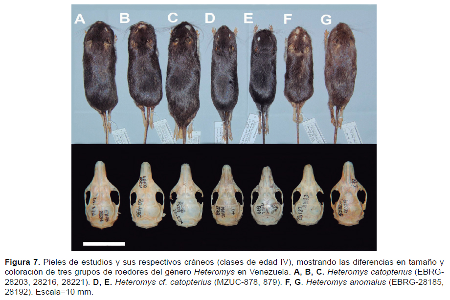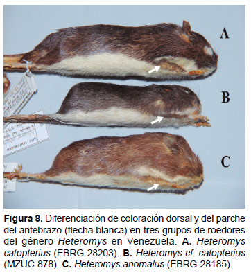 En el Neotrópico, los ratones mochileros o ratones de abazones del género Heteromys (Castorimorpha, Heteromyidae), han recibido mayor atención taxonómica en años recientes, lo cual ha generado el descubrimiento de nuevas especies previamente consideradas como parte de Heteromys australis, H. desmarestianus y H. anomalus (Anderson y Jarrín-V 2002, Anderson 2003, Anderson y Timm 2006, Anderson y Gutiérrez 2009). Para el caso de Venezuela, el género está restringido al norte del río Orinoco (ausente en la biorregión Guayana), con una amplia distribución geográfica, incluyendo registros en una gran variedad de hábitats y en áreas insulares como la isla de Margarita (Anderson y Gutiérrez 2009). Los especímenes reportados provienen desde el nivel del mar hasta por encima de 2425 m (Anderson y Gutiérrez 2009). Actualmente se reconocen cuatro especies en el país (Anderson 2015), de las cuales dos son endémicas (Sánchez-Hernández y Lew 2012): Heteromys oasicus, restringido a la vegetación medianamente húmeda del Monumento Natural Cerro Santa Ana y la fila de Monte Cano en la Península de Paraguaná, noroccidente de Venezuela y H. catopterius, cuya distribución geográfica incluye la cordillera de la Costa Central y Oriental, mayormente en bosques nublados con alturas superiores a los 700 msnm (Anderson y Gutiérrez 2009). De las especies restantes, una es exclusiva de la biorregión andina (H. australis, cordillera de Mérida) y la otra (H. anomalus), se distribuye geográficamente en la cordillera de la Costa Central y Oriental, Llanos, sistemas de colinas Lara-Falcón, depresión del lago de Maracaibo y en la isla de Margarita (Anderson y Gutiérrez 2009, Boher-Benti et al. 2016). En la última revisión sobre taxonomía de Heteromys en Venezuela, Anderson y Gutiérrez (2009) examinaron todo el material depositado en colecciones zoológicas venezolanas y extranjeras referidas para sectores del centro y oriente del país (pertenecientes a las biorregiones de los Llanos, cordilleras de la Costa Central, de la Costa Oriental e Insular). Una de las áreas con vacíos de información, debido a la falta de especímenes provenientes del bosque nublado depositados en colecciones naturales fue la Sierra de Aroa. Ese sistema montañoso forma parte del sector más noroccidental de la cordillera de la Costa y llama la atención desde el punto de vista biogeográfico, porque se encuentra separado de las cordilleras de la Costa Central y de Mérida por las depresiones de Yaracuy y Lara (Anderson y Gutiérrez 2009). En estudios posteriores sobre listados taxonómicos y de ecología poblacional en mamíferos de la Sierra de Aroa, se lograron capturar los primeros ejemplares de Heteromys y los mismos fueron asignados a H. anomalus para los bosques semideciduos en los sectores más bajos del Parque Nacional Yurubí y H. catopterius para los bosques nublados (García et al. 2012, 2013, 2016). En los últimos años se ha colectado una mayor cantidad de especímenes del género Heteromys en los bosques nublados de la sierra de Aroa, lo que permitió revisar con más detalle su morfología (externa y craneal) y morfometría (lineal y geométrica). Así pues, en este trabajo se evaluó el estatus taxonómico de las poblaciones de la sierra de Aroa, derivando en el reconocimiento de una nueva subespecie, que es descrita en el presente artículo. En especial, se hizo énfasis en comparar el nuevo taxón con las subespecies nominales de H. catopterius y H. anomalus, porque están geográficamente más cercanas al área de estudio y son las únicas señaladas para Venezuela (Anderson 2015). Metodología