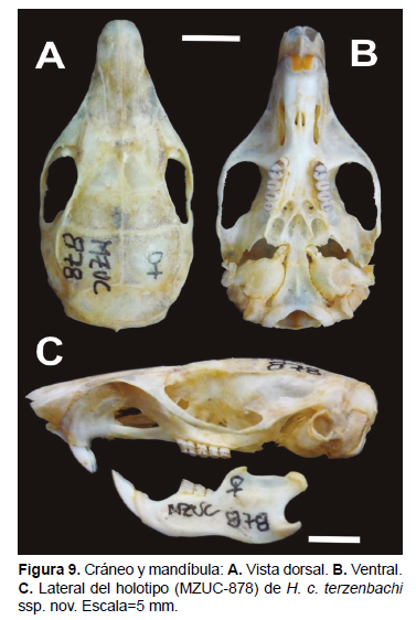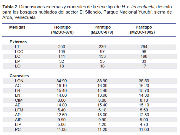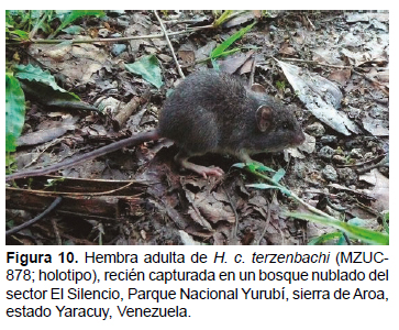 En un período menor a 20 años, los pocos esfuerzos de muestreos aplicados sobre la fauna de vertebrados de la sierra de Aroa y las posteriores revisiones taxonómicas de algunos de esos grupos han derivado en la descripción y reportes de varios taxa endémicos y conocidos solo de esa región. La lista incluye a dos mamíferos (Cryptotis aroensis; Quiroga-Carmona y Molinari 2012 y Rhipidomys fulviventer bisbali; García et al. 2015, 2016), dos anfibios (Caecilia flavopuntacta, Roze y Solano 1963 y Dendropsophus yaracuyanus, Mijares-Urrutia y Rivero 2000) y diez peces (Hyphessobrycon fernandezi, Brachyhypopomus diazi, Farlowella martini, Lasiancistrus nationi, Pseudopimelodus mathisoni, Trichomycterus arleoi, Creagrutus lepidus, C. lassoi, Hypostomus pagei y Chaetostoma yurubiense, Rodríguez-Olarte et al. 2005). Además, existen reportes de otros taxa de vertebrados endémicos de Venezuela con distribuciones geográficas para la sierra de Aroa: cinco mamíferos (Myotis handleyi, Alouatta arctoidea, Ichthyomys pittieri, Nephelomys caracolus y Rhipidomys venustus, García et al. 2016) y un anfibio (Agalychnis medinae, Rojas-Runjaic et al. 2014); además de algunos no considerados en la información publicada: dos mamíferos (Cebus brunneus y Sylvilagus floridanus valenciae, depositados en el MZUC) y tres anfibios (Aromobates sp., Gastrotheca ovifera y G. walkeri, depositados en la EBRG). En cuanto a la información ecológica para H. c. terzenbachi, los datos conocidos hasta el momento indican que está restringido a los bosques nublados u ombrófilos del Parque Nacional Yurubí en alturas superiores a los 800 msnm, mayormente en áreas con baja perturbación antrópica y fragmentación. La información relacionada con abundancia indica que esta especie puede ser considerada como un pequeño mamífero común en esos bosques nublados (García et al. 2013). Los datos sobre reproducción señalan que posiblemente tenga dos picos de gestación: uno entre abril y mayo y el otro para octubre, noviembre y diciembre (García et al. 2013). En la actualidad, los ecosistemas de la sierra de Aroa y todos aquellos ubicados en el norte de Venezuela enfrentan grandes presiones en cuanto a las reducciones de sus superficies boscosas, entre otras causas, por la alta concentración urbana y agropecuaria (García et al. 2016), lo que está condicionando la supervivencia de la diversidad biológica conocida y tal vez a la aún no registrada o conocida para esas biorregiones del país. Estas consecuencias son críticas, considerando que grandes extensiones de esas áreas ya se encuentran degradadas o con altos niveles de perturbación. La descripción de H. c. terzenbachi y su distribución geográfica restringida a la Sierra de Aroa, evidencia aún más el alto grado de endemismo que ocurre en esta área y el valor de conservación y protección de la cual debería ser merecedora, no solo por la diversidad de su biota, sino por resguardar las nacientes de los principales ríos que suministran agua para consumo humano en una zona con un desarrollo demográfico y urbanístico acelerado y no planificado (García et al. 2016). Agradecimientos