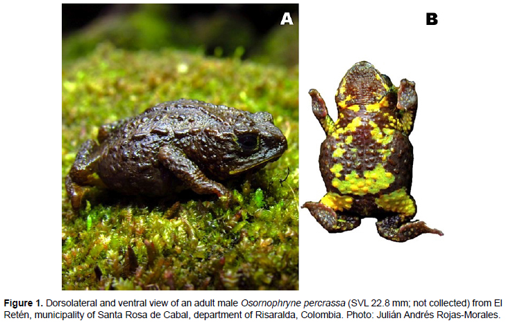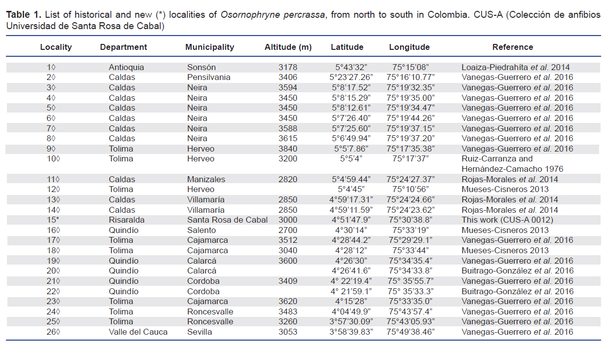 The Andean toad genus Osornophryne is an endangered lineage composed by 11 currently described species, confined to a small, but topographically complex biogeographic area (northern Andes of Colombia and Ecuador) (Páez-Moscoso and Guayasamin 2012). Five species occur in Colombia, which are: O. antisana Hoogmoed 1987, O. bufoniformis (Peracca 1904), O. guacamayo Hoogmoed 1987, O. percrassa Ruiz-Carranza and Hernández-Camacho 1976, and O. talipes Cannatella 1986 (Vanegas-Guerrero et al. 2016). Among these species, the Colombian endemic plump toad O. percrassa (Figure 1) is restricted to the Colombian Central Andes in the departments of Antioquia, Caldas, Quindío, Tolima and Valle del Cauca (from north to south), at elevations between 2700 and 3840 m (Hoogmoed 1987, Vanegas-Guerrero et al. 2016). Osornophryne percrassa is a leaf-litter dwelling species, commonly found under rocks and debris in trails borders and roads, inside the Andean forests and “Páramos”; however, it has not been recorded in open disturbed habitats (Bernal and Quevedo 2004, Vanegas-Guerrero et al. 2016). Several aspects about its morphology, habitat use, behavior, and geographic distribution have been discussed in different works (Ruiz-Carranza and Hernández-Camacho 1976, Escobar-Lasso and González-Duran 2012, Burbano-Yandi et al. 2015, Vanegas-Guerrero et al. 2016). Osornophryne percrassa is listed as Endangered (EN) under criteria B1ab (iii) (IUCN 2015) and is listed as “Vulnerable” on the Colombian Red List of Amphibians, because the known geographical distribution is less than 5.000 km2 and its suitable habitat on the Colombian Central Mountain range is fragmented and declining, both in extent and quality (Bernal and Quevedo 2004). Also, O. percrassa is listed as an Endangered species by the Colombian Ministerio de Ambiente y Desarrollo Sostenible (MADV 2017). A potential distribution model showed a larger area of suitable habitat than was previously assumed for O. percrassa, including areas around the National Natural Park Los Nevados (Vanegas-Guerrero et al. 2016). Here we provide new information about the distribution of the plump toad O. percrassa, based on first records of this species for the department of Risaralda. Also, we have gathered and updated all known localities throughout the distribution range of O. percrassa, which might be used to do spatial analysis and design conservation actions. Two specimens of O. percrassa were recorded in Andean forest at the sector of El Retén, road to Potosí, municipality of Santa Rosa de Cabal, department of Risaralda, Colombia (04°51’48” N; 75°30’39” W, WGS84, elevation 2856 m). This locality is located inside the protected area “Distrito de Conservación de Suelos (DCS) Campoalegre”. A juvenile individual (lacking testes, 19.6 mm snout-vent-length) was collected on 19 April 2013 at 17:30 h, on a concrete wall at the edge of a fragment forest, and an adult male (22.8 mm SVL) was observed on 5 august 2017 at 11:00 h, under a rotten trunk. Both specimens show the diagnostic characteristics of the species: truncated snout with non-projected papilla and light-yellow spots on the belly (Figure 1A) (Ruiz-Carranza and Hernández-Camacho 1976, Páez-Moscoso and Guayasamin 2012). The specimens were photographed, but only first individual was euthanized and deposited at the amphibian’s collection of the Universidad de Santa Rosa de Cabal (accession number CUS-A 0012); the second specimen (Figure 1B) was photographed and released in the same place where it was found. These are the first records of O. percrassa for the department of Risaralda, filling a geographical gap between the known localities reported in Caldas and Quindío departments (Figure 2, Table 1). The record of O. percrassa in Risaralda was highly predictable, taking into account the distribution model showed by Vanegas-Guerrero et al. (2016). Individuals of O. percrassa were found inside a protected area DCS Campoalegre, but it is important to highlight that this category is not strict and rigorous in terms of biodiversity conservation, since it allows different uses of lands, such as livestock and agricultural exploitation, as we observed between the years 2014 and 2017 (Figure 3). In this way, it corresponds to Corporación Autónoma Regional de Risaralda (CARDER), to take necessary measures to avoid the cattle breeding expansion and agricultural frontier, over the natural Andean forests where O. percrassa and other endemic and threatened amphibians have been found, such as Centrolene quindianum and Andinobates bombetes (Mantilla et al. 2015). Unfortunately, O. percrassa doesn’t have a national conservation plan throughout its distribution range. Therefore, it is really important to do it with a committed network between researchers, NGO’s, universities and local communities. To date, there are known 26 records of O. percrassa throughout its distribution range (Table 1). These records are distributed in five departments (Antioquia, Caldas, Quindío, Tolima and Valle del Cauca), and only in the department of Caldas has been established a conservation plan of the species in its territory (Burbano-Yandi et al. 2015). Therefore, is really urgent develop a conservation plan for this species in the territory of Risaralda. Acknowledgements