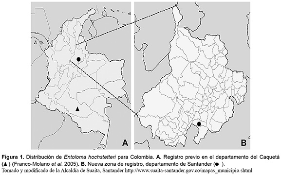 De acuerdo con Raj et al. (2014) el género Entoloma s.l. es uno de los grupos más grandes del orden Agaricales Underw, con 1500 especies reportadas en todo el mundo (Kirk et al. 2008). Para Colombia, según Vasco-Palacios y Franco-Molano (2013) la familia Entolomataceae Kotl. & Pouzar está representada por siete géneros distribuidos en trece especies, de las cuales cuatro corresponden al género Entoloma: E. clitocyboides E. Horak & Singer, E. ferrugineogranulatum (Singer) E. Horak, E. lyophylliforme (Singer) E. Horak y E. hochstetteri (Reichardt) G. Stev. Entoloma hochstetteri (Reichardt) G. Stev. también conocida como E. virescens sensu Horak., fue registrada por primera vez por el micólogo austríaco Reichardt (1866), al conocer una ilustración realizada por un coleccionista, quien encontró este hongo en bosques nativos de Nueva Zelanda. La ilustración fue descrita inicialmente como Hygrophorus hochstetteri (Reichardt). Esta seta se caracteriza por presentar colores que van del azul oscuro a azul verdoso con tintes grisáceos (Alves y Coelho 2012). Puede variar a azul negruzco o azul amarillento con manchas oscuras por contacto, maduración o corte. El píleo es por lo general convexo a levemente cónico (Horak 1976). Microscópicamente las esporas presentan 4 ángulos, siendo cuboidales (Franco-Molano et al. 2005, Alves y Coelho 2012), de coloración rosa a marrón rosáceo cuando se encuentran en masa (Wright y Alberto, 2002). Los queilocistidios son cilíndricos a claviformes (Horak 1976). En Colombia, la especie ha sido reportada únicamente para el departamento de Caquetá por Franco-Molano et al. (2005) y Vasco-Palacios y Franco-Molano (2013). En esta ocasión, se presenta información micológica que amplía la distribución geográfica de E. hochstetteri para el departamento de Santander, Colombia.