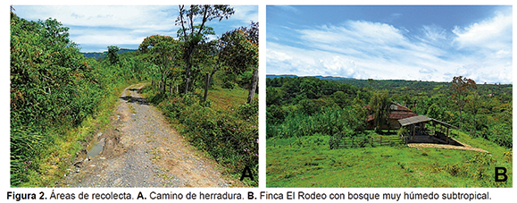 Área de estudio. La zona de estudio se localiza en el corregimiento de Olival, ubicado en las coordenadas 6° 09’ 11.82” N y 73° 20’ 26” O, a 1700 msnm, municipio de Suaita, departamento del Santander (Figura 1). Se muestreó en la Finca El Rodeo, Monte del Águila y San Antonio. La zona se caracteriza por presentar una temperatura mínima de 17.5ºC y máxima de 24ºC, con precipitación promedio anual de 2850 mm3. De acuerdo con la clasificación de zonas de vidas de Holdridge (1971), en el área muestreada se presenta un bosque muy húmedo subtropical (bmh-ST), sometido a actividades de ganadería extensiva, cultivo de caña (Saccharum officinarum L.), yuca (Manihot esculenta Crantz.) y plátano (Musa paradisiaca L.). Recolecta y determinación. Se llevó a cabo un muestreo tipo oportunístico, durante 9 días, en 4 hectáreas del ecosistema y en un camino de herradura que convergía con este (Figura 2). Los basidiomas se fotografiaron, recolectaron y describieron macroscópicamente siguiendo las recomendaciones de Largent et al. (1986) y Franco-Molano et al. (2005). Luego se deshidrataron y depositaron en el Herbario de la Universidad Pedagógica Nacional, Sede Bogotá. Para la observación microscópica se realizaron cortes a mano alzada de los basidiomas, que se montaron en KOH al 5% y rojo Congo. Se utilizó el reactivo de Melzer como prueba bioquímica para determinar la presencia de almidón en las basidiosporas. Las estructuras fúngicas se observaron en microscopio con sistema digital DMS 653 y se midieron con el software Piximétre. El material estudiado se identificó por comparación macroscópica y microscópica con lo reportado por Horak (1976), Franco-Molano et al. (2005), Largent y Abell-Davis (2011) y Alves y Coelho (2012). Los colectores se indican con iniciales: C. Pinzón (CP), J. Pinzón (JP).