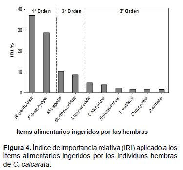 presas más ingeridas por C. calcarata. Conclusión: La especie C. calcarata se alimenta de una amplia variedad de presas.