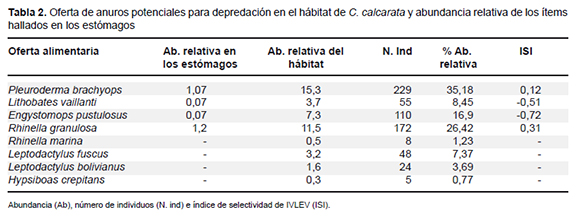 Objective: To establish the trophic ecology Ceratophrys calcarata, the type of prey, their amount and relative importance of their diet. Methodology: