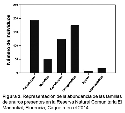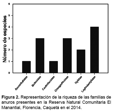 Objective: To record the diversity of Anura associated with the Manantial Community Nature Reserve, Florencia, Caquetá, Colombia. Methodology: The field phase was carried out by means of auditory and visual intensive search in two habitats: quebrada and riparian forest. SigmaPlot 1 1.0, 9.0 and virtual program Estimates iNEXT statistical program was used. Results: A total of 564 individuals of Anura, corresponding to 14 species, nine genera and six families were recorded. The family Leptodactylidae had the highest species richness with 4 corresponding to 3 genera (Adenomera, Lithodytes and Leptodactylus); the aromobatidae (Hyloxalus bokagei) and Centrolenidae family (Teratohyla Midas) presented only one species each. Discussion: Both the creek and riparian forest showed similar values of species richness, which may be due to the structural complexity in relation to the types of niche that can offer anura and environmental variables associated with these systems because to the presence of different layers and variety microhabitat. Conclusion: This type of research allows us to understand how ecosystems are in terms of diversity and abundance of species structure comprising the same.