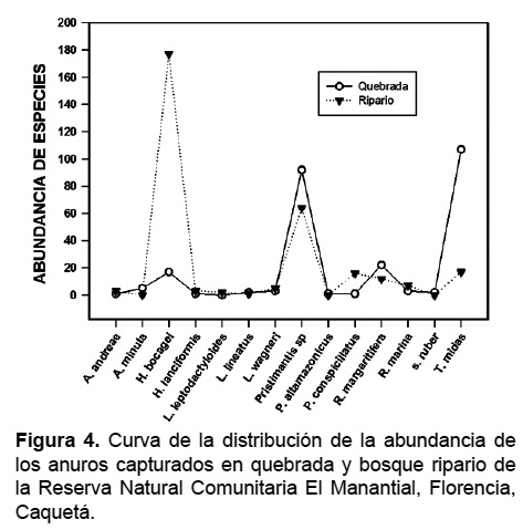 Área de estudio. La Reserva Natural Comunitaria el Manantial (RNCM), se encuentra ubicada en el corregimiento el Caraño al nororiente de la zona urbana de la ciudad de Florencia (Caquetá), sobre la quebrada la Perdiz, afluente del río Hacha (01°37´830” N y 075°35´5.1” W), a una altura entre 427 a 493 metros de elevación. Según Holdridge (1987) la zona corresponde a la zona de vida de bosque húmedo tropical (bh-T), presenta precipitación media de 3793 mm/año, temperatura promedio de 25°C y humedad relativa de 83% (Estrada-Gonzáles y Rosas-Patiño 2007). En el manantial se localiza el sendero ecológico Moniya Amena, caracterizado por su afluente hídrico la quebrada la Perdiz (Pérez-Rico et al. 2001) (Figura 1). Se presentan coberturas vegetales, como bosque secundario y pastizal en la parte alta de la reserva, en donde se encuentran zonas de vivienda. La quebrada se caracteriza por un afluente rocoso con una anchura aproximada de 20 metros compuesta por numerosas cavernas formadas por grandes rocas cubiertas de vegetación arbustiva (Díaz- Ricaurte et al. 2016), igual que en el bosque ripario que está compuesto además por árboles con un DAP de 10 a 15 metros; este fue el lugar mejor conservado, por lo cual se tomó como área de estudio que están más afín con el mayor número de especies de anuros que se pueden encontrar en el lugar (Angulo et al. 2006). El muestreo que se realizó fue al azar, se tomó un punto de partida, tomando todos los individuos que se encontraban teniendo en cuenta el registrarlos hasta llegar a un punto final del lugar de muestreo. Fase de campo. Los muestreos en la RNCM fueron realizados durante los meses de septiembre a noviembre del año 2014; se utilizó la metodología descrita por Angulo et al. (2006), que consistió en una búsqueda visual, examinando activamente individuos sobre la vegetación, troncos, hojarasca (de la quebrada y el bosque ripario de la RNCM). Los muestreos se realizaron en horarios diurnos (07:00-12:00) y nocturnos (19:00-24:00) estableciéndose las horas de muestro por horas/hombre, lo que correspondió al esfuerzo de las mismas tres personas en cada salida, teniendo en cuenta estos horarios debido a las variaciones diarias del clima que pueden afectar la actividad de las especies en la zona, como la temperatura y la radiación que son factores determinantes en los ritmos de actividad, al igual que la humedad (Manzanilla y Pefaur 2000). Los anuros fueron capturados en bolsas de tela húmeda, se fotografiaron (Anexo 1) y liberaron en el sitio en el que se hallaron; luego se registraron datos de variables ambientales como la humedad, la temperatura y la precipitación durante el período de muestreo. Análisis de datos. Los valores de abundancia, riqueza de especies y distribución de abundancia obtenidos para quebrada y bosque ripario se graficaron en el programa estadístico SigmaPlot 11.0 (Edward 2002). Se estimó el índice de diversidad de Chao Jaccard el cual evalúa el grado de similitud para los recuentos de abundancia entre comunidades (Chao et al. 2006) en el programa Estimates 9.0 (Colwell et al. 2012). Para conocer qué tan completos fueron los muestreos en ambas comunidades, se realizó un análisis de cobertura de muestreo en el programa virtual iNEXT (Hsieh et al. 2014), una herramienta que refleja mejor el comportamiento de los muestreos en relación con qué tan completos fueron; a su vez permite corregir sesgos de metodologías tradicionales como las curvas de acumulación o rarefacción de especies que comparan la riqueza de especies entre sitios que no son similares, o que el esfuerzo de muestreo no es el mismo. Resultados