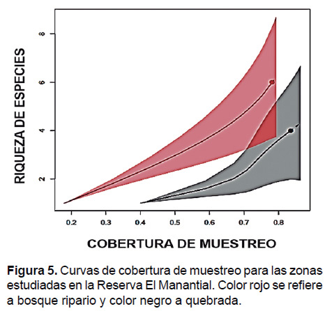 Se registró un total de 564 individuos de anuros, correspondientes a 14 especies, nueve géneros y seis familias (Tabla 1). La familia Leptodactylidae presentó la mayor riqueza con 4 especies correspondientes a 3 géneros (Adenomera, Lithodytes y Leptodactylus); obtuvieron riquezas intermedias para las familias Craugastoridae (Pristimantis) y Bufonidae (con los géneros Amazophrynela y Rhinella) con 3 especies cada familia y una baja riqueza para ambas. Las familias Aromobatidae (Hyloxalus bokagei) y Centrolenidae (Teratohyla midas) solo presentaron una especie cada una (Figura 2). La familia más abundante en todo el estudio fue Aromobatidae (194), seguida por la familia Craugastoridae (174), Centrolenidae (124) y las menos abundantes Bufonidae (49), Leptodactylidae (17) y la que registró menor abundancia en todo el estudio fue Hylidae con 6 individuos (Figura 3). La Quebrada La Perdiz, fue el hábitat que presentó mayor riqueza de especies, capturándose 307 individuos, donde la especie más representativa fue Hyloxalus bocagei (177) seguido por Pristimantis sp. (64) y especies con poca riqueza como Hypsiboas lanciformis (3), Adenomera andreae (3), Leptodactylus leptodactyloides (2) y Lithodytes lineatus (1) (Figura 4). En bosque ripario se registró un total de 257 individuos, Teratohyla midas y Pristimantis sp. presentaron mayor riqueza para este hábitat con 107 y 92 individuos respectivamente. Las especies que presentaron riqueza intermedia fueron Rhinella margaritifera (22) e Hyloxalus bocagei (17), mientras que las de poca riqueza fueron Scinax ruber (2), Hypsiboas lanciformis, Lithodytes lineatus, Adenomera andreae, Pristimantis altamazonicus y Pristimantis conspicillatus, todas con un individuo registrado (Figura 4). La estimación de la cobertura de muestreo para quebrada y bosque ripario durante la fase de estudio se pueden observar en la Figura 5. Aquí, se evidenció el comportamiento de la diversidad de anuros para quebrada y bosque ripario en función de los muestreos realizados. Nuestro análisis reflejó que para bosque ripario se alcanzó una cobertura de muestreo del 79% mientras que para quebrada fue de 87% (Figura 5). La cobertura de muestreo alcanzada guarda relación con los valores de riqueza de especies tanto en quebrada como en bosque ripario. Los resultados del índice de diversidad de Chao Jaccard fueron de 0,972.