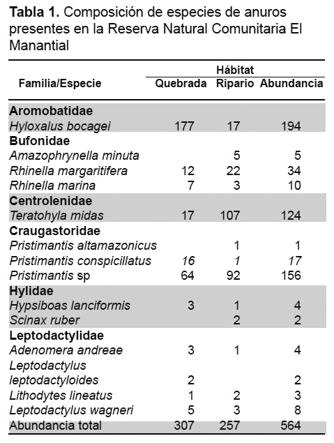 Keywords: Anura, Diversity, Quebrada, Reserve, Riparian forest.