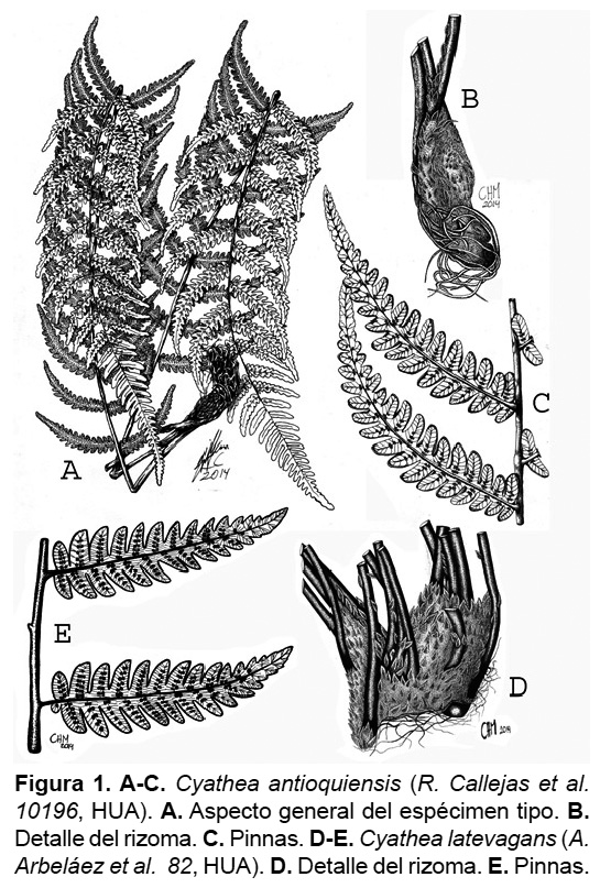Cyathea antioquensis A. Rojas, sp. nov. (Fg. 1). TIPO. COLOMBIA. Antioquia: Mpio. Carmen de Viboral, vereda La Viborita, 6 km SE del Mpio. de La Unión, en la vía de la troncal Sonsón-La Unión a la vereda Viborita, cabeceras del Río Buey, 5°52ʹN, 75°20ʹW, 2100-2600 m, 20 jun 1991, R. Callejas et al. 10196 (holotipo: HUA). Diagnosis. The new species differs from C. latevagans (Baker) Domin by its rhizome scales with a narrower pale margin, stipe and rachis with scurf, and sessile, linear-oblong, falcate pinnae. Descripción. Epífita; rizoma ca. 1 cm de diámetro, reptante a suberecto; escamas del rizoma 2-3 x 1-1,5 mm, ovadas, negras con un margen pardo amarillento de ca. 0.1 mm de ancho, adpresas, imbricadas; frondas 62-85 m de largo; pecíolo 8-18,5 cm de largo, 0,4-0,5 cm de diámetro basalmente, liso o apenas con botones en la unión de las escamas, negro, opaco, escamoso y con caspilla, las escamas como las del rizoma, densas basalmente y escaseando hasta la mitad, la caspilla de escuámulas adpresas, estas menos 0,5 mm de largo, medianamente densas; lámina 50-63 x 8-12 cm, 1-pinnado-pinnatífida a 2-pinnada basalmente, la base truncada a levemente reducida, el ápice gradualmente atenuado y pinnatífido; raquis negro en la base y parte media a pardo distalmente, liso, con caspilla ventralmente, pelosos dorsalmente, los pelos 1-1,5 mm de largo, pardos crespos, arqueadas hacia el ápice; pinnas basales y medias 5.5-8 x 1,2-1,5 cm, linear-lanceoladas a linear oblongas, falcadas, sésiles basalmente, atenuadas distalmente; costas pardo amarillentas a pardas, con nódulos basalmente, pelosas dorsalmente, los pelos como los del raquis, dispersamente escamosas ventralmente, las escamas 0,5-2 x 0,2-0,5 mm, pardo amarillentas, bicolores con el centro más oscuro, margen eroso a ciliado; pínnulas o segmentos 0,5-0,8 x 0,25-0,4 cm, 12-15 pares, sésiles, falcados, obtusos distalmente; nervaduras 5-7 pares por segmento, libres o raramente 1-bifurcadas a pinnadas, glabras dorsalmente, con caspilla amarillenta dispersa dorsalmente; tejido laminar entre las nervaduras glabro en ambas superficies; soros inframedios; sin paráfisos; indusio globoso, pardo-amarillento, que rodea casi completamente al receptáculo. Etimología. El nombre del epíteto específico hace referencia a la localidad tipo. Cyathea incognita A. Rojas, sp. nov. (Fg. 2). TIPO: COLOMBIA. Meta: Mpio. San Juanito, Cañón del Río Guatiquía, near casa San José, 4°30.962ʹN, 73°41.361ʹW, 3325 m, 3 May 2007, M. Sundue y A. Vasco 1326 (holotipo: HUA; isotipo: NY). Diagnosis. The new species differs from C. gracilis Griseb by its terrestrial habit, thinner rhizome, rhizome scales with a broad pale margin, shorter and bipinnate fronds, atropurpureous rachis, sessile pinnae and sori without indusia. Descripción. Terrestre; Rizoma 4-6 mm de diámetro, corto reptante o suberecto; frondas 0,65-0,95 m de largo; pecíolo 35-50 cm de largo, 1,5-3 mm de diámetro basalmente, atropurpúreo a negro, liso, lustroso; escamas del pecíolo 2,5-4 x 1-1,5 mm lanceoladas, pardo oscuro en el centro, con el margen pardo-amarillento; caspilla ausente; lámina 2-pinnada, el ápice gradualmente atenuado; raquis atropurpúreo, liso, glabro en ambas superficies; pinnas sésiles; pinnas medias 6-8 x 1,6-2,4 cm, lanceoladas, inequiláteras, articuladas basalmente, más anchas del lado basiscópico, sésiles, ápice agudo; costas pajizas; pínnulas 0,8-1,5 x (0,2-) 0,3-0,5 cm, lanceoladas a oblongas, sésiles, margen entero a levemente lobulado, las basales acroscópicas más reducidas; costas pajizas, articuladas al raquis, densamente pelosas dorsalmente, los pelos 0,5-1 mm de largo, crespos, patentes, amarillentos, dispersamente pelosas ventralmente, los pelos menos de 0,5 mm hialinos a amarillentos, patentes; cóstulas ventralmente con pelos 0,2-0,7 mm, hialinos a amarillentos, adpresos, dispersos; venas 6-9 pares por pínnula, libres, simples, pelosas en ambas superficies, los pelos del haz más largos; tejido laminar peloso dorsalmente, glabro ventralmente; escamas costales 0,5-1 mm x 0,3-0,5 mm, lanceoladas pardas con margen amarillento, margen entero a eroso, soros mediales, sin indusio. Etimología. El nombre del epíteto específico hace referencia a que al ser una planta pequeña con grado de división menor del usual, la misma fue identificada por los colectores como un Thelypteris, pasando a estar escondida (incógnita) para los estudiosos de los helechos arborescentes. Cyathea longipetiolulata A. Rojas y A. Tejedor, sp. nov. (Fg. 3). TIPO: COLOMBIA. Risaralda: Municipio de Pueblo Rico, Parque Regional Karagabi, Hoyo Frío, 2500 m, 6 abr 2004, D. Sanín 409 (holotipo: FAUC). Diagnosis. The new species differs from C. divergens Kunze by its ascending fronds, stipe and rachis without scurf (squamellae and hairs), pinnae and pinnulae with longer pedicle, less segments per pinnulae and evanescent indusia. Descripción. Tronco ca. 2 m de alto; frondas 3-5 m de largo, marcadamente ascendentes; pecíolo 140 cm, inerme en casi toda su longitud pero basalmente espinoso, rojo-pajizo opaco en material de herbario, verde brillante en vida, sin escuámulas; escamas del pecíolo 10-20 x 3-11 mm, ovadas a linear lanceoladas, pardo oscuro a pardo-rojizas, concolores a levemente más claras en el margen, peltadas; caspilla ausente; lámina 3-pinnado-lobulada, con las cóstula alada en las pínulas basales, el ápice gradualmente atenuado; raquis pardo a atropurpúreo, liso; pinnas 8-9 pares, pediculadas, el pedículo de 5-10 cm de largo; pinnas medias 50-75 x 30-35 cm; costas similares al raquis; pínnulas 8-17 x 4-6,5 cm, lanceoladas, pediculadas, el pedículo de 1-2,3 cm; segmentos 1-4 x 0,6-0,9 mm, 10-15 pares, serrados a lobulado-dentados, agudos a obtusos; segmentos basales libres; cóstulas glabras, opacas; nervaduras 10-15 pares por segmento, 1-2 bifurcadas, glabras; tejido laminar entre las nervaduras glabro; soros costales; paráfisos más co