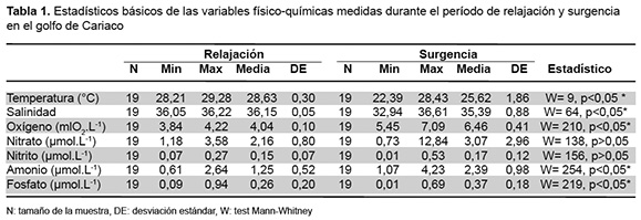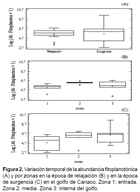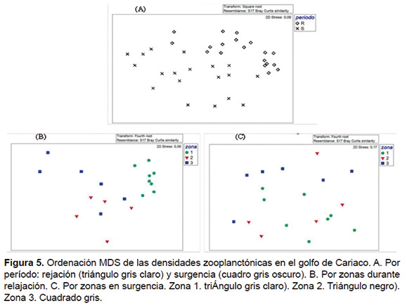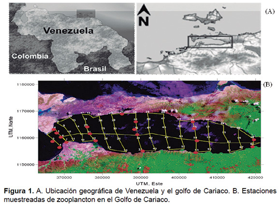 Área de estudio. El golfo de Cariaco es un ecosistema geográficamente semicerrado ubicado en la costa nororiental de Venezuela, al este de la cuenca de Cariaco (10°25’ y 10°35’ Lat. N y los 63°38’8” y 64°13’ Long. W; Figura 1). Las condiciones hidrográficas y químicas del golfo de Cariaco están influidas por las variaciones de la surgencia costera, la cual está íntimamente relacionada con el régimen de los vientos. Vientos prevalecientes del E-NE generan la salida de las aguas superficiales y la entrada de aguas subsuperficiales de la fosa de Cariaco a las capas más profundas e intermedias del golfo (Okuda et al. 1978, Martínez et al. 2011). Recolección y procesamiento de las muestras. Se escogieron 19 estaciones del golfo de Cariaco desde la boca hasta la zona interior del mismo (Figura 1); estas campañas se realizaron a bordo de B/O GUAIQUERI II, de la Universidad de Oriente, durante octubre de 2010 y abril de 2012, correspondientes a los períodos de relajación y surgencia, respectivamente. La salinidad, temperatura, concentración de oxígeno disuelto y abundancia fitoplanctónica se midieron a partir de las muestras de agua con botellas de Niskin (5 litros) adosadas a una roseta a 0, 5, 10 y 25 m. La temperatura y la salinidad se determinaron mediante una sonda multiparamétrica Hidrolab modelo Data Sonde 4. La concentración de oxígeno disuelto se determinó por el método de titulación modificado de Winkler (Strickland y Parsons 1972). Por otra parte, la concentración de fosfato y nitratos se establecieron de acuerdo con las recomendaciones de Gordon et al. (1993). La abundancia microalgal se determinó por el método de sedimentación de Utermöhl (1958). Las muestras para estudiar la biomasa y composición del mesozooplancton se recolectaron con red de Bongo de 60 cm de diámetro de boca, equipada con mangas de 333 mm y 555 mm de abertura de malla a las cuales se les colocó un medidor de flujo a fin de cuantificar el volumen de agua filtrada. Los calados se realizaron de 25 m hacia la superficie, con una duración de 15 min, a una velocidad de arrastre de 2 nudos. Las muestras se fijaron con formaldehído al 4%, neutralizado con borato de sodio. Cada muestra se homogenizó y se dividió en dos porciones iguales por medio de un separador de Folsom; una porción fue destinada a estudios de estructura de la comunidad y la otra para el análisis de la biomasa por medio del método gravimétrico (biomasa húmeda, Postel et al. 2000), sin separar en este proceso a los organismos gelatinosos; los datos se expresaron en mg m-3. Para la ubicación taxonómica de los organismos se tomaron tres alícuotas de 2,5 ml y se procedió al conteo e identificación hasta el máximo nivel taxonómico, utilizando los trabajos de Tregouboff y Rose (1957), Boltovskoy (1981,1999), Gasca y Suárez (1996). La densidad mesozooplanctónica, se expresó en ind.m-3. Análisis de los datos. Luego de comprobar que no se cumplieron los supuestos del análisis paramétrico mediante la prueba de normalidad de Kolmogorov-Smirov y homocedasticidad de Bartlet (Sheskin 2004), se utilizaron las pruebas no paramétricas (test de Mann-Whitney y Kruskall-Wallis). Se comparó la abundancia fitoplanctónica, biomasa y abundancia zooplanctónica en los dos períodos estudiados a través de la prueba Mann-Whitney. Las estaciones fueron divididas en tres grupos, de acuerdo con su ubicación, correspondiendo la zona 1 (estaciones 2,4,5,6,7,20,21,22) a las ubicadas en la entrada del golfo; la zona 2 (estaciones 33,34,35,36,37) halladas en el centro y la zona 3 (53,54,55,56,68,69) con las estaciones encontradas en la parte oriental o saco del golfo. Las comparaciones de las 3 zonas en los períodos estudiados, se realizó con la prueba de Kruskal-Wallis. Para estas pruebas se utilizó el software estadístico Statgraphics plus 5.1. En los casos donde se hallaron diferencias significativas, se probaron las diferencias con la prueba a posteriori de diferencias mínimas significativas (LSD) (Sokal y Rohlf 1981). Se graficaron los resultados con diagramas de cajas (boxplot). Se realizó un análisis multivariado sobre la distribución y abundancia de los principales grupos del mesozooplancton. Se efectuó la transformación de la raíz cuarta de los datos para crear una matriz de similitud de Bray-Curtis. Para visualizar las diferencias en los grupos del mesozooplancton en dos dimensiones con los datos de abundancia de cada zona y período estudiado, se utilizó el escalamiento multidimensional no métrico (MDS). El análisis de similitud (ANOSIM) se utilizó para probar las diferencias entre los grupos de la comunidad del mesozooplancton entre las zonas y períodos. La identificación de los principales grupos taxonómicos que más contribuyen a la similitud y la disimilitud entre las zonas y los períodos de estudio se realizó con la prueba de porcentaje de similitud (SIMPER), para esto se utilizó el Primer 6 & Permanova (Clarke y Gorely 2006).
