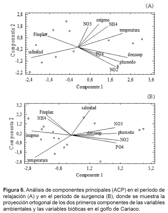 In order to study the environmental response mesozooplankton in the Gulf of Cariaco, biomass, species composition and abundance in October 2010 (relaxation time) and April 2012 (time of upwelling) was analyzed. Samples were collected at 19 stations throughout the gulf. Zooplankton samples were collected by vertical tows using a Bongo net for 15 minutes. It was measured in situ salinity, temperature, dissolved oxygen concentration and nutrients. Levels of salinity, temperature and oxygen for relaxation time ranged from 35.89 to 36.29; From 27.13 to 29.5°C; 3.24 to 4.34 mg.L-1, respectively; while upwelling ranged from 25.76 to 36.86; From 21.66 to 29.1°C; 5.81 to 7.14 mg.L-1, respectively. Biomass and abundance mesozooplankton presented significant temporal variation was greater relaxation, unlike phytoplankton abundance showed no temporary differences.15 zooplankton groups in upwelling relaxation and 10 were identified; the composition reflected the dominance of copepods and cladocerans, being thirdly the gelatinous plankton (apendiculates and siphonophores). During the relaxation period biomass and abundance higher, mainly at the entrance of the Gulf (zone 1), influenced by the waters of the Manzanares river it was recorded. Temporary differences remain an important attribute in the mesozooplankton community in the Gulf of Cariaco and spatial variations.