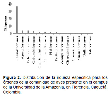 riqueza con 37 (59,6 %) especies, la familia Tyrannidae con 12 (19,3%)