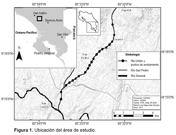 La avifauna costarricense cuenta con unas 911 especies (Obando-Calderón et al. 2014), con siete nuevos reportes a nivel nacional para la Lista Oficial de Aves de Costa Rica, lo que lo posiciona como uno de los países con mayor diversidad y endemismo en Centroamérica debido a la variedad de climas y ecosistemas que posee (Garrigues 2007), los cuales se dividen en cuatro provincias ornitológicas: Tierras Altas, Vertiente del Caribe, Pacífico Norte y Pacífico Sur (Stiles y Skutch 2007). Las aves cumplen funciones muy importantes en la polinización, dispersión de semillas, control de poblaciones y restauración de ecosistemas. Además, este grupo es un buen bioindicador de diversidad y para medir los efectos del colapso climático antropogénico (Vargas-Rojas 2010, González et al. 2011). Por otra parte, se han convertido en un importante atractivo para investigadores, aficionados y/u observadores de aves en el país, lo cual ha sido aprovechado en algunos sectores de Costa Rica para desarrollar actividades ecoturísticas (Driscoll et al. 2011). A pesar de esto, la avifauna se ha visto amenazada principalmente por factores antrópicos como pérdida de hábitat, contaminaciones, desprecio (en algunas especies mal llamadas plagas), domesticación y choques contra vidrios, esta última causa la muerte de millones de aves alrededor del mundo (Menacho-Odio 2015). La mitigación de estos impactos se ha convertido en un reto para la humanidad en los últimos años (Bustamante y Grez 1995). La expansión agrícola que se dio en el Valle de El General sobre todo a partir de la segunda mitad del siglo XX con la construcción y mejora de las vías de comunicación (Hernández 2008), provocó la tala de prácticamente todos los bosques de la zona, quedando solo algunas pequeñas áreas protegidas como el Refugio Nacional de Vida Silvestre Longo Mai (452 ha; 7 km al este del río Unión), Los Cusingos Bird Sanctuary (78 ha; 10 km al noroeste del río Unión), y algunos bosques ribereños (Janzen 1983). Los estudios ornitológicos, se han enfocado en los Cusingos y zonas aledañas (López-Vargas y Ureña-Chacón 2004). Los demás espacios han sido destruidos de manera descontrolada ante la corrupción y poca intervención institucional (Estado de la Nación 2016). Aunque sean los bosques ribereños prácticamente los únicos remantes de la zona, estos poseen gran importancia como corredores biológicos, hábitat, retención de sedimentos, entre otras, además de que conserva los espacios de confluencia de los ecosistemas acuáticos, anfibios y terrestres. Sin embargo, estos se han visto afectados por deforestación, extracción de agua de los ríos, contaminación con agroquímicos, aguas residuales y desechos sólidos (Guariguata y Kattan 2002, Ceccon 2003). Uno de esos casos es el río Unión, que no cuenta con ningún estudio ornitológico. Recientemente una empresa constructora privada reportó 31 especies de aves basándose en revisiones bibliográficas de las guías ornitológicas costarricenses (Miranda 2013), como parte de los requisitos del Estudio de Impacto Ambiental (EsIA) para la construcción del Proyecto Hidroeléctrico San Rafael en el río Unión (7250 KWh), que se suma a 13 proyectos más en el Valle de El General (Jiri Spendlingwimmer com. pers.) para conectar con el Sistema de Interconexión Eléctrica de los Países de América Central (SIEPAC) y abastecer el Proyecto Mesoamérica promovido por el Grupo Banco Mundial para aumentar la producción y el saqueo en la región (Delgado 2015). A lo largo del río Unión habita el martín pescador (Megaceryle torquata), que es un ave que permanece principalmente cerca de los cuerpos de agua; se alimenta sobre todo de peces, aunque también consume insectos; los nidos los fabrican en paredones y miden alrededor de dos metros de profundidad. Se distribuye ampliamente por Centroamérica y Sudamérica (Stiles y Skutch 2007). Según BirdLife International (2016), esta especie no se encuentra bajo ninguna categoría de vulnerabilidad debido básicamente a su amplia distribución, aunque en algunas zonas existen situaciones que pueden estar afectando su estabilidad. Este trabajo tiene como objetivo conocer las especies de aves que habitan o visitan los bosques ribereños y/o el río Unión. Además, tiene como un segundo objetivo generar datos que aporten al conocimiento del estado de conservación de M. torquata en este y otros ríos. Metodología