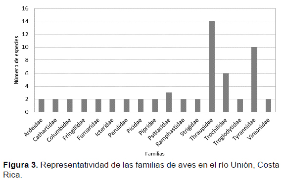 Objectives: To document the species of birds that inhabit and/or pass through the Unión River, Valle de El General, Costa Rica, and to estimate the relative abundance of Megaceryle torquata. Methodology: 20 points were established for 12 km and was observed once per point every two months between July 2014 and July 2015. For the population estimation of M. torquata, six linear transects of 500 m each were sampled monthly One, from June 2013 to June 2015. Both studies were between 6:00 am and 10:00 am. Results: 78 species were observed, nine migratory, 68 residents, and one with both status; Five endemic species from Costa Rica and Panama and two from Nicaragua, Costa Rica and Panama (Jackknife 1=82.9), classified into 34 families. The family with the most species was Thraupidae, with 14. In five months studied with migratory species, P. rubra occurred in four, I. galbula, O. peregrina and M. crinitus, in three, and the remaining five in one or two. The species M. torquata was observed on 118 occasions, for a relative abundance of 0.87 ind/km. The highest abundance months were May and June, with 1.33 ind/km, and the lowest were February, October and December, with 0.5 ind/km. Conclusion: the riverside ecosystems of this river have relevance in terms of habitats and biological corridors, despite their fragmentation. The proper use of this basin will be of importance for ecotourism, protection and ecosystem restoration. Keywords: Abundance, Birds, Conservation, Ecotourism, San Rafael Hydroelectric Project, Riparian forests.