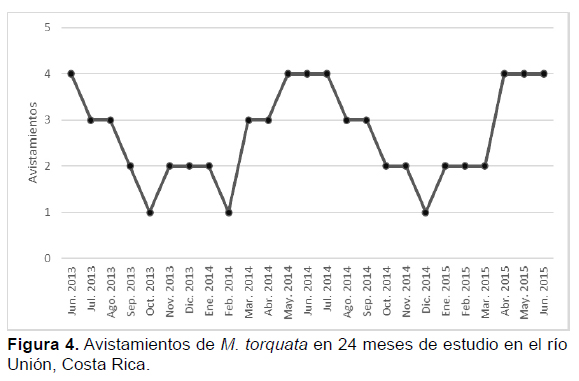 Área de estudio. El Pacífico Sur de Costa Rica es sumamente biodiverso, con un conjunto de características óptimas para que habiten muchas especies de aves (Garrigues 2007). El Valle de El General posee un clima húmedo tropical, con aproximadamente 4 meses de estacionalidad climática (Hammel et al. 2004). El río Unión, coordenadas 9°19'13"N, 83°31'01"W, se encuentra en el centro del Valle de El General, sus tributarios nacen en la Cordillera de Talamanca y desagua en el río General, con una dirección norte-sur. Tiene una longitud aproximada de 12 km, iniciando en la confluencia entre el Río San Rafael y la Quebrada Pavón a 867 msnm, en la localidad de San Rafael, hasta la confluencia con el río General, en la localidad de Santa Ana a 540 msnm. Los suelos a la orilla del río Unión han sido utilizados sobre todo para pastoreo, plantaciones de café y caña de azúcar (observación personal) (Figura 1). Lista de especies. Se siguieron los parámetros establecidos por Ralph et al. (1996) para monitoreos por puntos de radio fijo. Se escogieron 20 puntos de conteo a lo largo del río, con aproximadamente 500 m de distancia entre uno y otro, los cuales se establecieron con el software ArcMap versión 10.0. Se observó y anotó durante 10 min las especies que no habían sido vistas anteriormente. Para este estudio no se incluyeron cantos. Los avistamientos en cada punto se realizaron una vez cada dos meses entre julio de 2014 y julio de 2015, entre las 6:00 am y 10:00 am, con binoculares 8x40. En total se visitó siete veces cada punto. Cada día se muestreó un máximo de 5 puntos con más de 2 km de distancia entre uno y otro. Algunas especies que no fueron observadas en este estudio fueron reportadas por Miranda (2013). Sin embargo, la metodología utilizada por dicha autora se basó en la revisión bibliográfica de Garrigues (2007) y Stiles y Skutch (2007), por lo que no se tiene evidencia de que habiten y/o visiten la zona. En la lista se indica si la especie es residente (R) o migratoria (M). Las especies endémicas de Costa Rica y Panamá se indican como "CR-Pan", mientras que las endémicas de Nicaragua, Costa Rica y Panamá se indican como "Nic-Pan" (Tabla 1). Los datos sobre distribución y estatus migratorio se tomaron de Garrigues (2007), y algunos nombres comunes en español fueron consultados en los trabajos de Obando-Calderón et al. (2014), Sandoval (2006), y la Lista Oficial de las Aves de Costa Rica de la Asociación Ornitológica de Costa Rica (AOCR) para los nombres latinos. Además se calculó el estimador no paramétrico Jackknife 1 que se basa en el número de especies que ocurren solamente en una muestra, y se utiliza para reducir el sesgo de los valores estimados (Miller 1974). Poblaciones de M. torquata. Se consultó la metodología de Vilches et al. (2012). Se realizaron seis transectos de franja mensuales de 500 m cada uno en diferentes sitios a lo largo del río desde junio de 2013 a junio de 2015, para un total de 144 recorridos (72 km). La duración de los recorridos dependió de las condiciones del terreno (x̄=45,41 min; σ=25,99 min por recorrido). Por día se realizó un solo transecto para evitar contar más de una vez el mismo individuo. Los recorridos se llevaron a cabo entre 6:00 am y 10:00 am. Se incluyeron únicamente los individuos observados de forma directa o con binoculares 8x40 que estuvieran perchados o en vuelo. Se calculó la abundancia mediante la fórmula: P= I/D