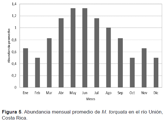 Lista de especies. Se observaron 78 especies (Jackknife 1=82,9) clasificadas en 34 familias. Del total, 9 son migratorias (Figura 2), 68 residentes, y una posee ambos estatus, de las cuales cinco son endémicas de Costa Rica y Panamá, y dos de Nicaragua, Costa Rica y Panamá (Tabla 1). Las especies residentes que son observadas más a menudo son C. aura, C. atratus (Cathartidae), P. domesticus (Passeridae), C. spiza, R. costaricensis, S. maximus, T. episcopus, T. larvata, S. corvina (Thraupidae), y T. grayi (Turdidae). Para el caso de las migratorias, P. rubra (Cardinalidae) e I. galbula (Icteridae) son las más comunes (Tabla 1). Entre setiembre de 2014 y mayo de 2015 fue el período que se observaron especies migratorias. Durante ese lapso se realizaron cinco visitas a los 20 puntos de conteo. La especie P. rubra (Cardinalidae) se avistó en cuatro de las cinco visitas, mientras que I. galbula (Icteridae), O. peregrina (Parulidae) y M. crinitus (Tyrannidae), se observaron durante tres de las cinco vi- sitas. Las restantes cinco especies migratorias se reportaron en una o dos de las cinco visitas. Las especies E. forficatus (Accipitridae), E. platypterus (Accipitridae), B. ibis (Ardeidae), C. aura (Cathartidae) y C. atratus (Cathartidae) solo se observaron en vuelo. Al ser observaciones restringidas a la cuenca, algunas especies no fueron incluidas, porque se avistaron en sitios lejanos al río. Las especies D. lineatus (Picidae), M. tuberculifer, P. sulphuratus (Tyrannidae), S. corvina (Thraupidae) y T. savana (Tyrannidae) sólo fueron observadas en los puntos que se establecieron en potreros o áreas abiertas con presencia de especies vegetales como Cecropia spp. (Cecropiaceae), Clidemia octona (Melastomataceae), Piper aduncum (Pipera- ceae), Rottboellia cochinchinensis (Poaceae) y Urera baccifera (Urticaceae), entre otras, aunque no se observó dispersión de semillas por parte de estas especies de aves. Las especies restantes se observaron tanto en terrenos boscosos como no boscosos. Las endémicas no tuvieron un ecosistema específico en común. Más bien, algunas parecen estar adaptadas al sitio como el caso de P. frantzii (Ramphastidae) y R. costaricensis (Thraupidae), que frecuentan espacios alterados muy cercanos a los asentamientos urbanos. La familia con más especies fue Thraupidae (N=14), seguida por Tyrannidae (N=10) y Trochilidae (N=6), mientras que las fami- lias Alcedinidae, Caprimulgidae, Cardinalidae, Coerebidae, Corvidae, Cracidae, Cuculidae, Emberizidae, Falconidae, Momotidae, Passeridae, Rallidae, Tinamidae, Tityridae, Trogonidae y Turdidae tuvieron una baja representatividad con tan solo una especie. Por esta razón no fueron incluidas en la Figura 3. La familia Thraupidae además tiene las especies más comunes y visibles en la zona. Una práctica frecuente de atracción de aves en las casas es la instalación de comederos con bananos maduros en un sitio visible. Las especies que más frecuentan estos comederos son C. spiza, R. costaricensis, S. maximus, T. episcopus y T. larvata (Thraupidae), y T. grayi (Turdidae). Durante la época de aves migratorias se suman principalmente I. galbula (Icteridae) y P. rubra (Cardinalidae). Poblaciones de M. torquata. En total se observaron 118 individuos, de los cuales 110 se avistaron volando, mientras que los restantes ocho estaban perchados, para una abundancia total de 0,87 ind/km. El número de individuos aumentó levemente entre abril y agosto, mismo período en el que se observaron individuos juveniles (Figura 4). Durante las visitas fuera del estudio, se observó esta especie a lo largo del día, independientemente de las condiciones climáticas. Algunos estanques artificiales de tilapias (Oreochromis niloticus) son cubiertos con sarán para evitar la llegada de nutrias (Lontra longicaudis) y de los martín picador (M. torquata). Los meses de mayor abundancia promedio fueron mayo y junio, con 1,33 ind/km, mientras que los de menor abundancia fueron febrero, octubre y diciembre, con 0,5 ind/km. En todos los casos se observaron individuos solitarios y no se encontraron nidos. Las perchas fueron en rocas y ramas horizontales y largas de árboles de sotacaballo (Zygia longifolia: Fabaceae), que utiliza para lanzarse al agua a capturar peces (Figura 5). Discusión