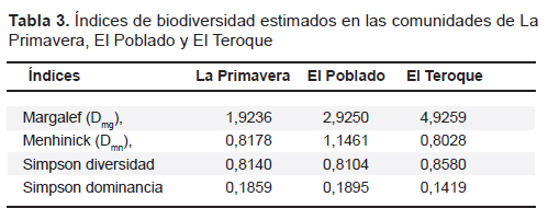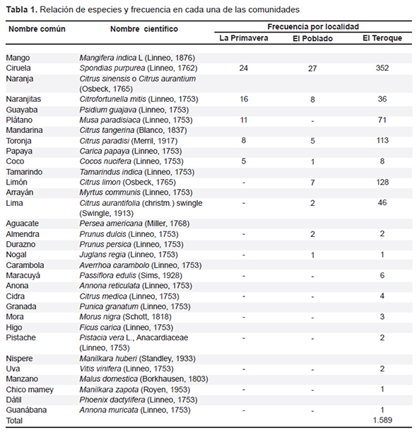 Se identificaron 59 especies arbóreas presentes en las comunidades estudiadas, 32 en la comunidad de El Teroque, 11 en La Primavera y 16 en El Poblado. Se encontró que en las tres poblaciones se repite la presencia de 9 especies (Tabla 1). La especie más abundante en las tres comunidades fue el mango (Mangifera indica L), es una especie proveniente de la India e introducida por los españoles durante el proceso de colonización entre los años 1521 y 1810 y es la más representada con presencia en las tres comunidades. Le sigue en abundancia la ciruela (Spondias purpurea) y el aguacate (Persea americana), ambas provienen de zonas tropicales de América y Mesoamérica. Las otras especies más representativas son: el limón (Citrus limon) de procedencia del sureste asiático y la naranja (Citrussinensis o Citrus aurantium) originaria de India, Pakistán y Vietnam, estas últimas introducidas por los españoles. La procedencia de los frutales encontrados aparecen en la Tabla 2. En la Tabla 1 se muestran las especies y frecuencia registradas en los traspatios de cada comunidad; se estimaron los índices de diversidad relativa y el rango de variación. El Teroque, fue la comunidad que presentó mayor diversidad, con 32 especies, y tuvo el mayor índice de Margalef y el menor índice de dominancia de Simpson (0,1419). La comunidad de La Primavera fue la menos diversa, con tan solo 181 especies. Por otra parte la comunidad de La Primavera y El Poblado, presentaron la menor dominancia de 195 y 1.589 (Tabla 3). Discusión