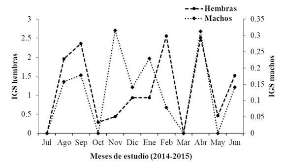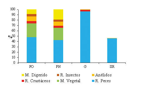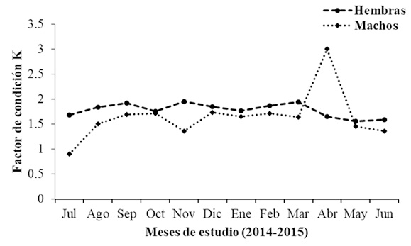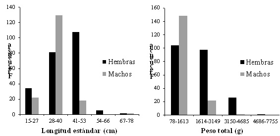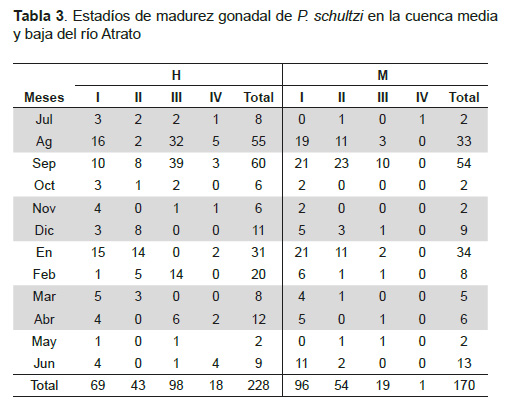 Del total de 398 individuos capturados, 228 fueron hembras y 170 machos. La longitud total osciló entre 19,1 y 85,5 cm, con promedio de 44,7 (±9,8) cm, la longitud estándar varió entre 15,5 y 78 cm, con promedio de 36,9 (±8,5) cm, donde la mayor frecuencia de talla de captura estuvo entre 28 y 53 cm LE, equivalente a 47,2%. El peso varió entre 78 a 7.755 g, con un promedio de 1.455 (±977) g (Figura 2). Figura 2. Distribución de talla y peso de P. schultzi en la cuenca media y baja del río Atrato. Relación longitud-peso. En la Figura 3 se observa la relación potencial altamente significativa (R2=0,97). El coeficiente de crecimiento b varió durante el período de estudio (Tabla 2), con un valor promedio de 2,9 que no evidenció diferencias estadísticamente significativas al valor de 3 (p=0,19), de acuerdo con la t-student (p>0,05), indicando un crecimiento de tipo isométrico. Figura 3. Relación longitud-peso de P. schultzi en la cuenca media y baja del río Atrato. Factor de condición. El factor de condición de P. schultzi fue de mayor valor para hembras en los meses de marzo (1,94±1,20), septiembre (1,92±0,37) y noviembre (1,95±0,77), y para machos en el mes de abril (3±3,1); los valores más bajos correspondieron al mes de mayo para hembras (1,55±0,03) y julio para machos (0,90±0,58) (Figura 4). Figura 4. Variación mensual del factor de condición (K) de P. schultzi en la cuenca media y baja del río Atrato. Estimación de la proporción sexual. Se observó un predominio de las hembras (n=228) sobre los machos (n=170), en casi todo el período de estudio a diferencia de los meses de enero y junio, donde no se evidenció diferencias estadísticamente significativas, correspondiendo a una proporción sexual de 1,3(H): 1(M) (p>0,05). Estados de madurez gonadal. En la Tabla 3 se observan los diferentes estadíos mensuales de madurez para P. schultzi, donde el mayor número de individuos maduros se observa en los meses de agosto y septiembre para sexos combinados; el mayor número de individuos en proceso de maduración para hembras se presenta en el mes de enero, y septiembre para machos. Índice gonadosomático (IGS). De acuerdo con el índice gonadosomático estudiado (Figura 5) la variación en el tiempo de estudio presenta un incremento para hembras y machos coincidente en los meses de abril (H: 2,51±2,10; M: 0,31±0,32), agosto (H: 1,95±1,41; M: 0,15±0,10) y septiembre (H: 2,36±1,74; M: 0,17±0,17). El incremento para hembras se evidencia en los meses de febrero, abril, agosto y septiembre, y en los machos en enero, abril y noviembre; coincidiendo el mes de abril para ambos sexos. Figura 5. Variación mensual del índice gonadosomático (IGS) de P. schultzi en la cuenca media y baja del río Atrato. P. schultzi de acuerdo con los valores del IGS y los estadíos de madurez sexual analizados, reporta dos picos reproductivos: uno entre enero y abril y otro entre agosto y septiembre, lo que además se evidencia en la abundancia y mercadeo de individuos a lo largo del área de estudio. Estimación de la fecundidad. La fecundidad fue estimada a partir de 92 hembras analizadas en estadío III, con un rango de talla entre 29 y 78 cm LE con promedio de 44,7 cm LE, obteniendo una fecundidad promedio de 61.967 ovocitos por hembra, con una desviación estándar de ±35.317. Estimación de la talla mínima y media de madurez sexual. Se observó que las hembras inician el proceso de madurez sexual a menor talla que los machos, estimando una talla mínima de madurez de 29 cm LE, mientras que para los machos fue de 30 cm LE. La talla media de madurez sexual se determinó en 32,2 cm para hembras y 33,8 cm LE para machos (Figura 6). De acuerdo con lo anterior se plantea una talla de captura de 35 cm LE para P. schultzi en el río Atrato. Figura 6. Talla media (TMM) de madurez sexual para hembras y machos de P. schultzi en la cuenca media y baja del río Atrato. Conducta trófica. Se determinaron seis ítems alimenticios en la dieta de P. schultzi: restos de peces, material vegetal, restos de crustáceos, anélidos, restos de insectos y material digerido. El ítem restos de peces, de acuerdo con la frecuencia de ocurrencia, frecuencia numérica, gravimetría e índice de importancia relativa, fue el más representativo alcanzando un valor superior a 42% (Tabla 4 y Figura 7), lo que permite sugerir que P. schultzi es una especie carnívora con preferencia en peces y consumos secundarios u ocasionales de anélidos, crustáceos e insectos. Del total de los estómagos, 62,9% se encontraron vacíos. Figura 7. Conducta trófica de P. schultzi en la cuenca media y baja del río Atrato. Producción pesquera. Esta especie se comercializa ampliamente en Quibdó, entre 15.000 y 20.000 pesos por kg, dependiendo de la temporada de oferta de otras especies; es obtenida generalmente a través de tolas (cuyas carnadas son generalmente especies de Astyanax) y trasmallos. La captura total registrada en las siete comunidades de la cuenca media y baja del río Atrato fue de 472,281 kg, entre los meses de julio de 2014 a junio de 2015, con una captura por unidad de esfuerzo (CPUE) promedio de 0,62 kg/hora. La comunidad con mayor contribución a estos desembarques fue Puné con 34,4% (Figura 8) y sus capturas se efectuaron principalmente con tola durante todos los meses del año, pero con pico en agosto (29,8%) y julio (24,9%). Figura 8. Desembarcos de P. schultzi en las localidades objeto