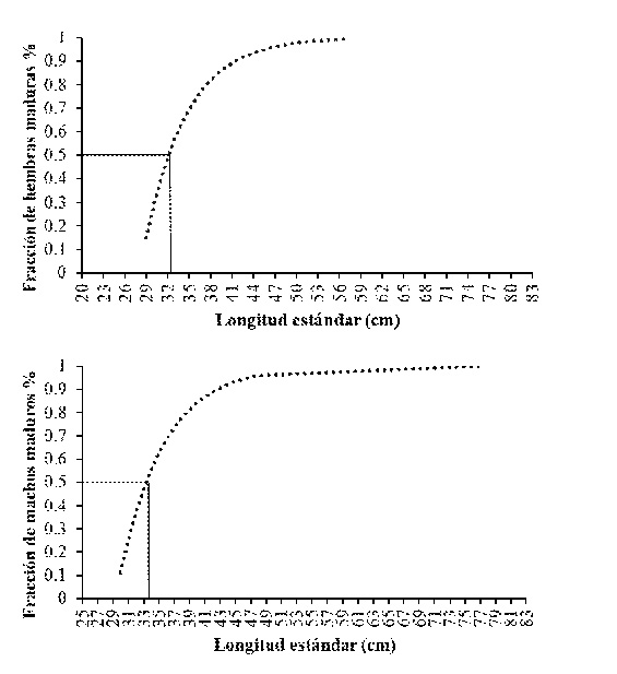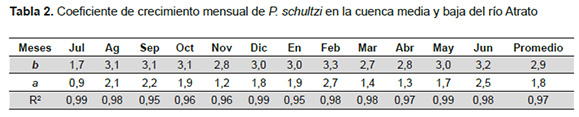 de estudio en la cuenca media y baja del río Atrato. Discusión La talla promedio de captura de 40 cm LE de Ortega-Lara et al. (2011) y la de Ramos y Rengifo (2010) para el río Quito fue de 38,9 cm LE, superiores a la estimada en este trabajo (36,9 cm LE). Tales diferencias se asocian, con la dinámica hídrica de la cuenca del Atrato y con las diferentes áreas de estudio, porque, las condiciones ambientales de la zona de captura, varían durante un año y entre años, debido a las fluctuaciones del volumen de agua, que son reguladas por las lluvias a nivel local y regional (Mosquera-Murillo 2017). Estas diferencias también se asocian con la disponibilidad de alimento y con el efecto de las actividades antropogénicas, así como por la selectividad del arte de pesca utilizado, la presión pesquera ejercida sobre el recurso y el número de individuos colectados (Olaya-Nieto et al. 2011), debido a que estos factores pueden ocasionar que fenómenos como el reclutamiento y la reproducción pueden variar entre años, afectando el vigor de las tallas y por ende las estructuras de las misma (López et al. 2001). El análisis de la relación potencial para las variables longitud y peso, evidencia que existe una estrecha relación entre estas dos medidas, sustentada por el alto valor de correlación (0,97). El coeficiente de crecimiento (b) de esta relación para sexos combinados con promedio de 2,9, indicó un crecimiento de tipo isométrico para la especie en el río Atrato, resultado que concuerda con lo reportado por Rivas-Lara et al. (2017), quienes reportan también un crecimiento isométrico (b= 2,8) para el Atrato. Esto permite inferir que, su ritmo de crecimiento es constante a pesar de la presión, sea ambiental o antrópica, a la que está sometida la especie en la cuenca del Atrato. No obstante, las variaciones mensuales presentadas por este coeficiente, pasando de alométrico negativo a positivo (b<1,7 y b>3,3) pueden ser utilizada como información adicional del estudio sobre ciclos estacionales de los procesos alimenticios y reproductivos (Lima-Junior et al. 2002) y para analizar diferencias de longitud y peso entre meses y años, especialmente cuando ha cambiado la dinámica de los cuerpos de agua, por lo que su estudio es muy importante para comprender el ciclo de vida (Lizama y Ambrósio 2002). El factor de condición es un buen indicador del crecimiento y un parámetro útil para conocer la conveniencia de un determinado ambiente sobre una especie (Gulland 1983), siendo más utilizado que el coeficiente de crecimiento (b) porque las variaciones observadas en este último son usualmente pequeñas para indicar la condición o bienestar de la especie basándose en la hipótesis de que los peces más pesados de una misma talla están en mejor condición que los menos pesados. Los valores de kg registrado para machos y hembras nos indican el grado de alimentación y sobrealimentación en que se encuentra la población de P. schultzi en la cuenca del Atrato; datos similares fueron reportados por Palacios et al. (2005) y Román-Valencia (2004), quienes dan a conocer valores por encima de uno, lo que nos lleva asumir que la especie hace uso óptimo de la oferta alimentaria presente en el medio, indicando que de alguna manera persisten condiciones ambientales que propician la buena alimentación de los individuos. La proporción sexual de 1,3(H):1(M) de P. schultzi en la cuenca del Atrato, muestran resultados similares a los de Maturín et al. (2005). Solo enero, marzo, mayo, octubre, noviembre y diciembre la población presentó tendencia al equilibrio de sexos; esta tendencia puede ser consecuencia de los aparejos de pesca utilizados en la cuenca, los cuales son selectivos a las hembras, debido a que estas generalmente alcanzan mayor tamaño que los machos. De acuerdo con los valores del IGS, la especie presenta dos picos reproductivos que van de enero a abril y de agosto a septiembre, coincidiendo con los datos suministrados por Román-Valencia (2004), Maturín et al. (2005) y Flores y Montoya (1985). El primer autor determinó, como posible período de madurez sexual, entre enero a marzo; el segundo y colaboradores evidenciaron que a partir del mes de agosto la especie inicia el proceso de maduración sexual, y posiblemente en el mes de septiembre se lleva a cabo la máxima maduración y luego el desove; Flores y Montoya (1985) reportan dos picos de madurez para P. schultzi: uno entre abril a mayo y otro entre noviembre a diciembre, siendo el primero el de mayor actividad. La época reproductiva de la especie está asociada con el período de sequía y aguas altas, que produce la migración o desplazamiento de con fines reproductivos, los cuales empiezan cuando los niveles del río disminuyen y el pez lo remonta buscando las áreas de dispersión en donde finaliza su maduración gonadal, con el consecuente desplazamiento hacia el cauce principal donde efectúan el desove. El promedio de ovocitos arrojado por hembra en este estudio (61.967), es inferior a los registrados por Maturín et al. (2005) y Román-Valencia (2004), cuyos valores fueron de 104.438 y 104.297 ovocitos respectivamente. Diferencias que se pueden atribuir a las épocas en que se realizaron los estudios y la presión pesquera que están siendo sometidas estas poblaciones en la actualidad. Cabe señalar que la fecundidad en los peces varía dependiendo de la edad del individuo, siendo mayor el número de huevos producidos por una hembra que presenta un mayor peso y tamaño (Duarte y Alcaraz 1989). En este caso estas diferencias también pueden estar asociadas directamente con las tallas de los ejemplares analizados, porque, la talla promedio registrada por Román-Valencia (2004) fue de 49,1 cm LE y el de esta investigación fue de 44,7 cm LE. Las tallas mínimas de madurez sexual estimadas para machos y hembras fueron superiores a las reportadas por Maturín et al. (2005) (24 y 26 cm LE) en el río Atrato, mientr