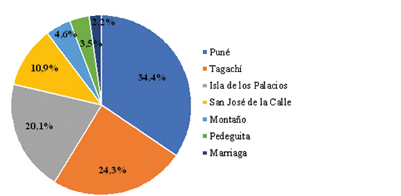 Área de estudio. La cuenca del río Atrato está ubicada a los 5° y 8° de latitud norte y los 76° y 78° de longitud oeste, a una altura de 35 msnm; presenta una humedad relativa cercana al 86%, su temperatura oscila entre los 28º y 32ºC (Holdridge 1996); la precipitación es entre 8.000 y 10.749 mm anuales, lo que determina que el régimen de lluvias sea intenso y prolongado creando una vegetación de selva ecuatorial (IGAC 1989). La investigación en campo se desarrolló en comunidades pesqueras y sitios de pesca de la cuenca media y baja del río Atrato y comprendió seis municipios, siete localidades y 15 ciénagas, las cuales se muestran en la Figura 1 y Tabla 1. Figura 1. Cuenca media y baja del río Atrato, localidades de influencia de la investigación. Fase de campo. Los ejemplares se colectaron entre julio de 2014 y junio de 2015, provenientes de las capturas artesanal de pescadores e investigadores, realizadas en diferentes sitios de pesca y desembarque en las localidades objeto de estudio, utilizando como arte de pesca el trasmallo y la tola. El primer arte utilizado “el trasmallo”, está construido por nailon, plomo y boyas (botellas de plásticos o icopor), con un tamaño promedio de 140 metros y ojo de malla de 3,5 centímetro; el tiempo promedio de exposición es de 15 horas. El segundo arte “la tola”, consiste en una cuerda de nailon o cabuya de 10 metros, a la cual se le amarran varios anzuelos con carnada viva, un extremo se asegura de algún árbol en la orilla, mientras el otro extremo se lanza a la mitad del río y se hunde gracias a la piedra o peso que se le ata. Las tolas se ponen después de las cuatro de la tarde y se revisa en la mañana siguiente (aproximadamente 15 horas). A los individuos se les registró la longitud total (LT) y longitud estándar (LE) con un ictiómetro graduado en centímetros (cm), y el peso total (WT) en gramo, con una balanza de precisión de 0,001 g. De igual manera, los ejemplares se evisceraron, con el fin de determinar visualmente el sexo, los estadios de madurez sexual (Vazzoler 1996), y extraer su gónadas y estómagos. Los ovarios en estadío III y los estómagos, se lavaron, etiquetaron y conservaron en formol al 10%, para luego hacer los respectivos análisis, en el laboratorio de ictiología de la Universidad Tecnológica del Chocó. Para la información pesquera se realizaron registros de pesca en forma directa y a través de pescadores en las comunidades de siete localidades, con el fin de estimar las capturas y su aporte a las pesquerías del área; en forma paralela se aplicaron entrevistas con el fin de describir la unidad de pesca individual y grupal, y estimar el esfuerzo de captura. Fase de laboratorio. En el laboratorio, las gónadas y los estómagos fueron lavados con abundante agua y secados con papel absorbente, para eliminar el exceso de formol o humedad. El conteo de ovocitos y la determinación de los ítems alimenticios se realizó con la ayuda de un estereoscopio y microscopio, conservando los datos de campo y registrando los hallazgos respectivos. Exploración de los datos. Se realizaron análisis de frecuencia por intervalos de clases y estadística descriptiva con los datos de las variables longitud total (LT), longitud estándar (LE) y peso total (WT), aplicando regresiones lineales para evaluar la dependencia de estas variables (r2). Relación longitud-peso. Se determinó realizando un análisis de regresión estimado mediante la ecuación logística WT = a LEb (Ricker 1975, Gulland 1983, Pauly 1984), donde el WT peso total del pez en gramos, a es una constante de regresión, equivalente a K (factor de condición), LE longitud estándar en centímetros y b es el coeficiente de crecimiento. Factor de condición. Se estimó con la ecuación: K = WT/LEb *100 (Weatherley 1972, Bagenal y Tesch 1978). Estimación de la proporción sexual. Se estimó de acuerdo con la ecuación de Wenner (1972): % machos =100 * (Nm/Nt), en donde Nm es el número de machos y Nt es el número total de individuos. Índice gonadosomático (IGS). Se calculó mes a mes para cada organismo, utilizando la fórmula de Kaiser (1973). IGS = 100 * (WG/WT), en donde WG es el peso de las gónadas y WT es el peso total del pez. Estimación de fecundidad. Se tomó una submuestra de cada una de las gónadas para realizar la estimación de la fecundidad total, aplicando el método gravimétrico (Laevastu 1980, Tresierra y Culquichicón 1993) con la siguiente ecuación: F = nG/g, en donde n es el número de ovocitos en la muestra; G es el peso de todos los ovocitos; g es el peso de la muestra. Estimación de la talla mínima y media de madurez sexual. Para determinar las tallas mínima y media de maduración sexual se tuvo en cuenta ejemplares machos y hembras en estadío III maduros y IV desovados. El análisis de la talla media de madurez sexual se determinó sobre la base del criterio del 50% de la fracción de individuos maduros (Arancibia et al. 1994), utilizando la siguiente ecuación logística (Echeverría 1987): Pi =1/1+ exp [r* (LE - lm)] donde Pi es la proporción de individuos sexualmente maduros a la longitud estándar (LE), r y lm son constantes. Conducta trófica. La cuantificación de los contenidos estomacales se efectuó mediante los siguientes métodos: 1. Coeficiente de vacuidad: (CV= 100* N estómagos vacíos/N total de estómagos analizados) (Windell 1971). 2. Gravimétrico: (G = peso del ítem A/peso de todos los ítems*100). 3. Frecuencia de ocurrencia: (FO =100*ocurrencia de presas del ítem A/n° total de estómagos con alimento) (Marrero 1994). 4. Frecuencia numérica: (FN = 100* n° de presas del ítem A/n° total de presas). 5. Índice de importancia relativa: (IIR= FO*G/100) (Hyslop 1980), en donde IIR representa el índice de importancia relativa, FO es el porcentaje de la frecuencia de ocurrencia y G es el porcentaje gravimétrico. Producción pesquera. Para calcular la captura por unidad de esfuerzo