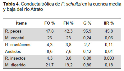 El bagre Pseudopimelodus schultzi es una especie que amerita especial atención, porque se encuentra en la categoría casi amenazada y tiene gran importancia a nivel de comercialización y consumo; en los últimos años se ha registrado una disminución debido a la gran demanda y presión pesquera que se ejerce sobre este recurso. Esta especie presenta un crecimiento isométrico en la cuenca media y baja del río Atrato, con dieta alimenticia carnívora de preferencia por los peces, talla promedio de captura de longitud estándar menor que en el resto de la cuenca, cuya época o período reproductivo, se presenta en dos picos, de enero a abril y de agosto a septiembre. Agradecimientos