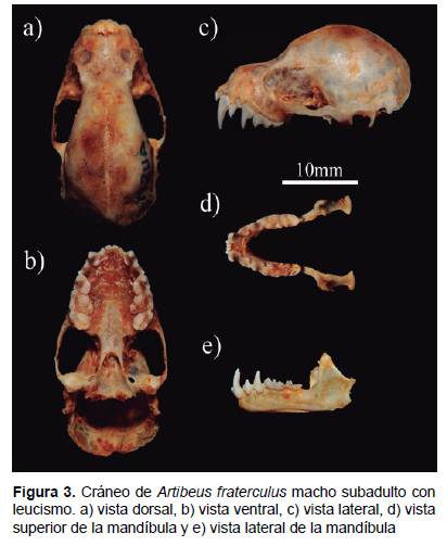 al. 2011).Para la región neotropical se han reportado 317 casos de coloraciones atípicas en 25 especies (Zalapa et al. 2016). Estas variaciones de la coloración anormal son: el albinismo, que se caracteriza por la falta completa de la pigmentación en la piel, el pelo e incluye la coloración de los ojos que tiende a ser rojiza; el piebaldismo, que es la falta de pigmentación presente en algunas partes del cuerpo, sin embargo, la tonalidad de los ojos es normal; y el leucismo, que se caracteriza por la ausencia parcial o total de la coloración en el cuerpo, pero con las uñas y los ojos con coloración oscura (Fertl y Rosel 2002, Miller 2005, Acevedo y Aguayo 2008). Sin embargo, algunos autores utilizan los términos albinismo parcial o albinismo para referirse al leucismo en murciélagos (Feng et al. 2007, Boada y Tirira 2010). En el neotrópico se han reportado casos de leucismo en murciélagos sobre todo para la familia Phyllostomidae en: Argentina, Brasil, Colombia, Ecuador, Guatemala, México, Perú y Venezuela (Geiger y Pacheco 2006, Hernández-Mijangos 2009, Boada y Tirira 2010, Medina y López 2010, Idoeta et al. 2011, García-Morales et al. 2012, Trujillo y Barahona 2014, Chacón et al. 2015). En Ecuador se conoce un caso de leucismo en Carollia perspicillata reportado por Boada y Tirira (2010). En adición, para el género Artibeus a nivel continental se han registrado algunas especies con alteraciones asociadas con el leucismo y piebaldismo (Oliveira y Aguiar 2008, MarínVásquez et al. 2010, Velandia et al. 2013, Olarte et al. 2014, Chacón et al. 2015). En el presente trabajo se da a conocer el primer reporte de leucismo para Artibeus fraterculus, que corresponde a un individuo macho subadulto, con los testículos no escrotados y epífisis cerradas. Este registro fue realizado el 18 de enero de 2014 en la localidad de Mangas Saiba (1°21’S, 79°42’ W; 32 m) del cantón Palenque, en la provincia de Los Ríos, en la costa central del Ecuador (Figura 1), ubicada a 10 km al norte del centro poblado de Palenque, caracterizda por ser un herbazal inundable ripario de tierras bajas del Chocó Ecuatorial, donde se pueden encontrar especies como: Gynerium sagittatum, Eichhornia crassipes, Ipomoea aquatica, Polygonum acuminatum (Josse et al. 2013). Sin embargo, la vegetación nativa ha sido reducida a pequeños fragmentos aislados, debido a las diferentes actividades que se practican en el cantón como el cultivo, la ganadería y la silvicultura. El espécimen que aquí se reporta, fue capturado mediante el uso de redes de niebla con un esfuerzo de muestreo de 24 horas/red/día; este individuo fue fotografiado, colectado y se encuentra depositado en las colecciones del Museo de Zoología de la Universidad del Azuay “MZUA” con el código MZUA-MA166 (Figura 2). Las medidas morfométricas externas y craneales fueron tomadas con un calibrador pie de rey (precisión 0.05) (Tabla 1, Figura 3). Para su determinación taxonómica se emplearon las claves dicotómicas de la Guía de Campo de los Mamíferos del Ecuador (Tirira 2007) y el Libro de Murciélagos del Ecuador (Albuja 1999). Según los datos morfométricos tomados, el espécimen corresponde a un individuo de A. fraterculus ya que las medidas y características como: el largo de la cabeza y cuerpo, el largo de las orejas, el antebrazo, el largo del cráneo y la fórmula dental, corresponden a las reportadas en la literatura (Tabla 1, Figura 3). Una especie similar en el territorio ecuatoriano es Artibeus aequatorialis con la que vive en simpatría, sin embargo, se puede diferenciar de A. fraterculus por tener las líneas faciales poco definidas, tamaño corporal mayor, procesos preorbitales y postorbitales poco desarrollados y puede presentar dos o tres molares inferiores a diferencia de A. fraterculus que tiene tres molares inferiores (Merchán y Bonilla 2016). El individuo presentaba una coloración atípica, con el pelaje de color blanco cremoso en casi la totalidad del cuerpo, alcanzando alrededor del 99%; sin embargo, el dorso es levemente más oscuro que el vientre, con las puntas de los pelos gris blancuzco desde la mitad del dorso hacia las patas. Las líneas superiores del rostro son apenas visibles (Figura 2), hoja nasal, trago y el borde de las orejas blancas-rosáceas. La membrana alar es blanca pero translucida en la proximidad a las falanges, donde los vasos sanguíneos se notan a simple vista. Las patas, antebrazos y dedos presentan una coloración rosada muy notoria. La coloración de los ojos es oscura y presenta las garras oscuras en la base, pero se tornan blancas translucidas hacia la punta (Figura 2). Dadas estas características de coloración, se ha determinado que el individuo presenta la anomalía de pigmentación denominada leucismo. Este es el primer registro de leucismo para Artibeus fraterculus y el primero para el género en el Ecuador; sin embargo este no es el primer reporte de alteración pigmentaria en el territorio ecuatoriano; otras especies de murciélagos ya han sido registradas, como es el caso de leucismo en Carollia perspicillata (Boada y Tirira 2010) y un caso de albinismo en Vampyrum spectrum reportado por Brito y León (2014). En el continente americano se han dado a conocer casos de leucismo en otras especies del género como: A. phaeotis (Sánchez et al. 1989), A. watsoni (Hernández-Mijangos 2009), A. jamaicensis (García-Morales et al. 2012), A. amplus y A planirostris (Marín-Vásquez et al. 2013), A. lituratus (Velandia et al. 2013), y A. anderseni (Tello et al. 2014); de estos A. lituratus es el murciélago con mayor número de reportes sobre leucismo. La frecuencia de leucismo en poblaciones de murciélagos es baja (Marín-Vásquez et al. 2010), lo cual podría deberse a que los cambios de coloración en el pelaje afecta negativamente a los individuos que presentan esta condición haciéndolos más susceptibles a la depredación, incluso afectándolos reproductivamente, pu