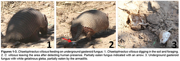 Chaetophractus villosus (Desmarest 1804) is a common armadillo distributed though the Gran Chaco of Bolivia, Paraguay and Argentina (Wetzel et al. 2007, Abba and Superina 2010) that was recently reassigned to the family Chlamyphoridae (Gibb et al. 2016). In Paraguay, it inhabits the Dry Chaco region of the country where it can be found in open arid areas, range lands, shrublands, and along roads (Smith 2008). In the Chaco region, the species is mainly diurnal, and is commonly seen foraging in open habitats not far from cover (Merritt 2008). However, in its southern distribution area it has nocturnal activity patterns (Abba and Cassini 2008). This armadillo is considered carnivorous-omnivorous, and major food items include invertebrates, small vertebrates, plants and carrion (Redford 1985, Noss et al. 2010). However, in the Bolivian Chaco, plant materials are the main dietary component for this species, followed by insects (Bruno and Cuéllar 2000, Cuéllar 2008). On 16 July 2014 at 12:26, we encountered an individual of Chaetophractus villosus along the side of an internal road on Estancia Montania, a cattle ranch (21º 58´ 6.92¨S; 60º 3´30.54¨W), located in the Dry Chaco region. It was digging in the soil, with claws and nose, foraging. As we approached to within 10 m, the individual left, leaving a small excavation. We observed and photographed an underground gasteroid fungus with white gelatinous gleba, partially eaten by the armadillo (Figure 1). Although several publications regarding diet of chacoan armadillos reported fibers or plant matter among the dietary components of this species (Redford and Eisenberg 1992, Bolkovic et al. 1995, Bruno and Cuéllar 2000, Cuélar 2008, Noss et al. 2010), this is the first record that we are aware of, for fungus as part of the diet of Chaetophractus villosus. Fungi have also been recorded in the diet of Zaedyus pichiy, another armadillo inhabiting semi-arid habitats (Superina et al. 2009). Gasteroid fungi are known to be common and frequent in xeric habitats, due to their independence of water in the spore release process (Kuhar et al. 2012). Wallis et al. (2012) found that fungi are a source of amino acids and digestible nitrogen for many animal species but the digestibility of the protein is generally low, requiring animals to develop strategies for utilization of these materials. The lack of detailed examination of stomach or fecal contents may be a factor underlying the absence of detection of fungus in the diet of armadillos. However, further investigation is required to clarify the importance of G. fungi as a component of the diet of Chaetophractus villosus in arid ecoregions such as the Dry Chaco. Acknowledgments