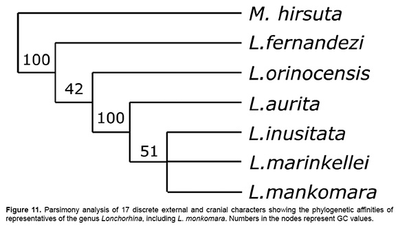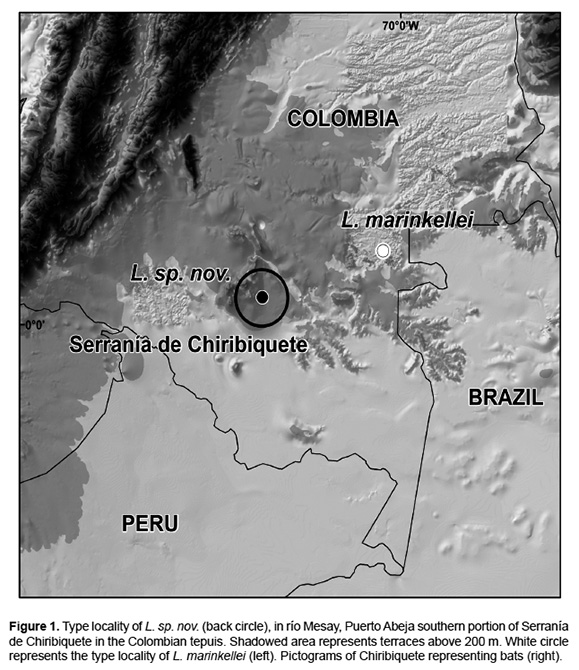 Molecular data (Baker et al. 2003), place the genus Lonchorhina in its own subfamily Lonchorhininae with a deep node that probably diverged from other phyllostomids between 24.7 and 21.6 mya (Baker et al. 2012). Species in the genus Lonchorhina are characterized by extreme modifications of external characters, represented by the largest telic structures found in the family: ears, tragus, and an enormous and extremely complex sword nose-leaf, that in some species could reach one and a half the dimensions of the skull, as well as a skull morphology, only found in this genus (Hernández-Camacho and Cadena 1978). The combination of discrete skull characters in the genus is unique among phyllostomids (Hernández-Camacho and Cadena 1978). These modifications are suggested to be adaptations associated with echolocation and insect prey detection inside mature stratified forests. Lowland forests in South and Central America are interrupted by several natural barriers isolating natural populations and eventually promoting speciation. Four of the five currently recognized species in the genus (L. fernandezi, L. inusitata, L. orinocensis, and L. marinkellei) are apparently restricted to the lowland forest of Northern South America in the Amazon and Guianan biogeographic provinces (Williams and Genoways 2007 for marginal localities). The environments typically inhabited by these bats, rocky outcrops of tepuis formations, are also unique. Representatives of the genus are considered cave bats, condition which imposes extra restrictions in terms of their expansion. Natural environments of Lonchorhina, and particularly large members of the genus (L. inusitata, L. mankomara, and L. marinkellei) are, in general, difficult to access. Bats in the genus Lonchorhina are rare in museum collections and some species such as L. fernandezi are only known from its holotype, or few specimens, such as L. marinkellei (Williams and Genoways 2007) preventing a full understanding of their biogeographic patterns and morphological variation. The only species that has a wide distribution is L. aurita described from Trinidad (Tomes 1863) which exists from Oaxaca, México south to South East Brazil, Bolivia, Perú and Ecuador; Trinidad and the New Providence Islands (Bahamas Islands) (Jones and Carter 1976). Lonchorhina aurita is currently considered a monotypic species (Williams and Genoways 2007). However, Anthony (1923) described the subspecies L. a. occidentalis based on three specimens collected in Guayas, Ecuador. Currently, L. a. occidentalis is considered as a junior synonym of L. aurita since Cabrera (1958) overlooked this taxon in his revision of mammals from South America. Nevertheless, Linares and Naranjo (1973) and Hernández-Camacho and Cadena (1978) suggested that L. a. occidentalis should be treated as a subspecies of L. aurita until additional material will be available to test its specific status. Unfortunately, Anthony (1923) did not provide a description of discrete skull characters to differentiate L. aurita from Guayas from its conspecific from Trinidad, and the author refer to the skull of L. a. occidentalis as “normal for the genus Lonchorhina, and very similar to that of L. aurita”, line that constitutes the only reference for skull morphology in Anthony’s (1923) description of the species. Although large skull L. inusitata is “similar to L. marinkellei in shape of the rostrum, there are differences in skull size. In L. inusistata the basisphenoid pits are shallow anteriorly contrasting the anteriorly deep basisphenoid pits of L. marinkellei. These two species also differ in shape and degree of hairiness of ears, noseleaf, and facial excrescences; underparts of L. inusitata are dark, while in L. marinkellei the venter is heavily washed (Williams and Genoways 2007). The same authors mentioned that the rostrum in L. marinkellei is higher than the braincase, while in L. inusitata the rostrum is about of equal height or slightly lower than the braincase.” Many specimens of L. inusitata have been either misidentified with the smaller and more common L. aurita (Genoways et al. 1981) (material from Suriname), or with the much larger and less common L. marinkellei (Brosset and Charles-Dominique 1991, Brosset et al. 1996) (material from French Guiana). The combination of discrete skull characters of L. mankomara holotype are unique among recognized species of Lonchorhina and represent a significant morphological evolution of characters historically assumed as conserved among mammals such as modifications in size and placement of dental elements. Biogeography. The morphological variation observed in our new species in conjunction with the geographic location of the holotype open a series of interesting questions about the biogeography of the genus. The Guayana Region is a discontinuous biogeographical area, formed by the rock outcrops of the Guayana Shield, one the oldest geological formation of South America. This formation of Precambrian origin is located in northern South America and spans close to two million square kilometers. However, outcrops of this formation are of insular character and form a complex landscape of lowland, upland and highland ecosystems (Gröger and Huber 2007), surrounded by tropical forest or savannas. Such a discontinuous arch of inselbergs (lowlands, about 300-500 masl) hills (uplands, >500 masl), and tepuyes (highlands, >3000 masl) form insular habitats with a highly endemic biota. The Guayana region has been subdivided into four major provinces: Eastern, Central, Pantepui, and Western (where Chiribiquete is located) (Huber 1994, Berry et al. 1995). The Western Guianan Province is represented by a mosaic of forests of Amazon and Guianan elements, hills and isolated mountain ranges, and savannas located between the Rivers Guaviare and Caquetá (Cortes and Franco1997). Hernández-Camacho et al. (1992) recognized the area of Chiribiquete as part of the “Complejo Vaupés”