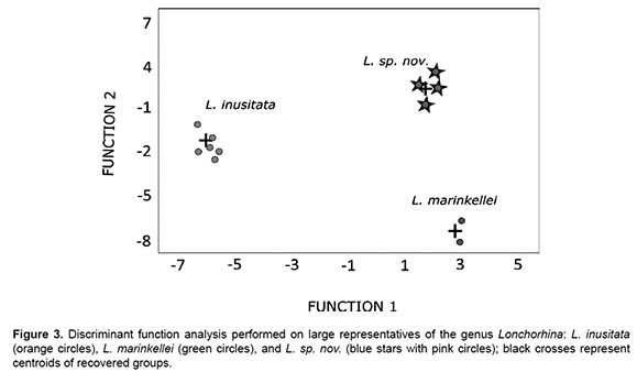 Principal components analysis. In our principal components analysis, the first two components accounted for most of the observed variation (PC1=92.8%; PC2=2.9%) with GSL, CBL, PAL presenting the highest loadings on the first component and explaining the variation among L. orinocensis, L. aurita, L. inusitata, and L. marinkellei; while distances across bullae presented the highest loadings on the second component, explaining the variation in size of L. fernandezi with respect to other species in the genus (Figure 2). Large Lonchorhina (ICN 14584-87♀) from PNN Chiribiquete, were separated from other species in the genus, in the factorial plane of our PCA, including the holotype of L. marinkellei and samples of this taxon from Mitú, Vaupés (near the type locality of the species) (Figure 2). ![]() Hypothesis testing. Discriminant function analysis, performed on analyzed specimens of large representatives of the genus falsified the hypothesis of a morphological homogeneity among specimens identified as L. inusitata, L. marinkellei, and specimens from PNN Chiribiquete (Wilks´s λ=0.0017; 0.05; χ2=163.5; 11.8; p>0.001; 0.001) (Figure 3). In our DFA all specimens from PNN Chiribiquete were correctly assigned in its own group, separated from specimens of L. inusitata and L. marinkellei, which were also correctly assigned in their own groups. Taxonomic results. We interpret morphological differences observed in our samples from Serranía de Chiribiquete as a distinct taxon deserving consideration as a new species in the genus which is described in this work.