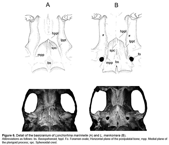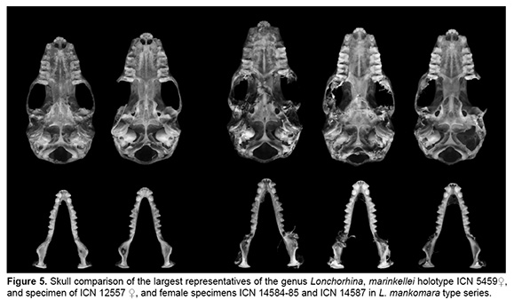 FAMILY PHYLLOSTOMIDAE Subfamily Lonchorhininae, Baker et al. 2003 Genus Lonchorhina Tomes 1863 Lonchorhina mankomara sp. nov. Lonchorhina marinkellei (Montenegro and Romero 2000)v6n2a10f1.jpg Lonchorhina marinkellei (Marín-Vasquéz and Aguilar-González 2005) Lonchorhina marinkellei (Mantilla-Meluk et al. 2009) Type locality. Río Mesay, Puerto Abeja (Tepui), Southeastern portion of Serranía de Chiribiquete The National Park Chiribiquete (PNN Chiribiquete), at 340 masl, department of Caquetá, Colombia; coordinates: 00°04´N, 72°26´W (Figure 1). The PNN Chiribiquete, corresponds to one of the most pristine and unexplored areas in the country, enclosing the oldest and largest series of Amazon pictograms (20.000 years bc) registered on the outcrops of the numerous inselbergs and tepuis, in which images of bats are of particular cultural importance. Type series. Three adult females collected at the same locality of the holotype on different days were included in the type series: ICN 14584♀, collected by O. Montenegro (collectors number OMD 138) on July 10, 1993; preserved as skin, skull extracted, partially damaged; nasals and basicranium broken; ICN 14585♀, O. Montenegro (collectors number: OMD 173) on July 12, 1993; preserved as skin, skull extracted in good condition; ICN 14587♀, collected by O. Montenegro (collectors number OMD 169) on 20 of July, 1993; preserved as skin, skull extracted in good condition at the moment of the description, but accidentally destroyed during the plague control process of the collection of the ICN (Figure 5). Distribution. Lonchorhina mankomara is only known from the type locality, and presumably confined to the lowland rocky outcrops of the PNN Chiribiquete, at department of Caquetá, in Colombia (Figure 1) Such lowland outcrops (also called inselbergs) belong to the Guayana Region, the recognized biogeographical entity assigned to the outcrops of the Guayana Shield (Maguire 1979, Huber 1994, Berry et al. 1995). Etymology. The name mankomara is composed of two parts; the first refers to the indigenous Karijona word manko (ma-nü-ko), meaning mother. Karijona or Carijona is an indigenous culture that inhabited the area of Chiribiquete and were virtually extinct after the genocide of indigenous people promoted by the rubber trading. Karijonas are currently represented by no more than 350 survivors that lost their own language. We wanted to honor Karijonas as documenters of the nature of Chiribiquete. The new species is named after Mara Meluk de Mantilla, mother of the senior author. My mother always encourage me to appreciate the wonders of nature and to appreciate cultural diversity. The name is also an extended recognition to all mothers, that have play the role of being keepers of knowledge and to promote curiosity and science in our societies. Diagnosis. The largest species known in the genus Lonchorhina (holotype: FA=64.1 mm; GSL=27.62 mm), closely related to L. marinkellei (Table 1). Telic structures enormously developed. Long noseleaf broad at the base (noseleaf length 40.15 mm; width at noseleaf base 12.2 mm) compared with L. marinkellei noseleaf (37 and 11.32 mm respectively), ear pinna (44.86 mm from notch), and tragus (22.3 mm). Skull characters. Skull larger than in other species of the genus (GSL>26.5); height of the braincase almost the same size of the rostrum; sagittal crest present, absent in L. marinkellei; in L. mankomara, the observed area of the basisphenoid from a ventral view has a rectangular appearance, longer than wider (width representing a 66% of its length), with the lateral sides concave (lateral sides delimited by the medial pterigoid plates); while in L. marinkellei the structure looks almost squared (width representing 86% of its length) and lateral sides convex (Figure 6). v6n2a10t1.jpg
