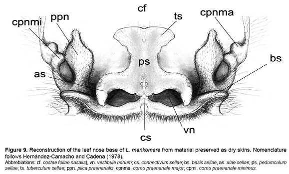 Dental characters. Lonchorhina mankomara has an overall more massive dentition than L. marinkellei; enlarged first premolar double the size of that in L. marinkellei; wide molars with elongated lingual bases; holotype of L. mankomara has an extra cusp on the hypoconal basin of the first and second upper molars, absent in other specimens of the type series and representatives of the other species in the genus (Figure 7). Lower incisors bilobed, contrasting the trilobed incisors of L. inusitata and L. marinkellei (Figure 8). Description. Largest species in the genus (Table 1); noseleaf enormously developed (0.9 to 1.49 the length of the skull; width 1/3 of the length of the skull) free margins not crenulated or waved, revoluted on the anterior surface of its base accompanied with ribs (costae foliae nasalis), and a medial costae on both the anterior and posterior surfaces of the noseleaf, formed by two muscular bands (sulcus medialis costae), absent in L. orinocensis. Presence of two nasal fossae (vestibule narium) separated by a septum (connectivum sellae), which in its posterior parts extends into the sella. The sella is constituted by the basis sellae, expanded anteriorly and laterally to form two mobile laminar expansions (alae sellae), on top of which the sellae is thinner forming the pedumculum sellae which is terminated in tuberculum sellae. On each side, the basal portion of the noseleaf is extended forming a plica praenarialis, which is extended to the basis sellae delimiting the vestibule narium. The narina are narrow and opened upwards inside the vestibuli close to a conspicuous excrescence (cornu praenariale major) of the plica praenarialis; lateral to that excrescence there is a second one, smaller in size (cornu praenariale minimus). All described ornamentations are absent in L. ferenandezi. In L. mankomara all ornamentations are enlarged compared to those in other species in particular the pedumculum sellae is longer and the tuberculum sellae is more expanded and simple than that of L. marinkellei. A representation of the ornamentations of noseleaf of L. mankomara and structure´s nomenclature used (Hernández-Camacho and Cadena 1978) is presented in Figure 9. Lonchorhina mankomara holotype has a dorsal pelage bicolored, white at the base and axial two thirds sepia 219 (Smithe 1975) (Figure 10); contrasting the unicolored amber 36 (Smithe 1975) dorsal pelage of L. marinkellei holotype. Dense and longer bicolored hair on the chest, olive brown 28 (Smithe 1975) at the base and drab 27 (Smithe 1975) on the tips; contrasting the shorter hair cinnamon brown 33 (Smithe 1975) at the base and drab 27 (Smithe 1975) on the tips of L. marinkellei holotype. In L. mankomara, there are long hairs (14.55 mm) extended laterally on the chest, that can be observed ventrally, absent in L. marinkellei holotype. Dense and long facial and ear hairs (>6.9 mm at the base of the ear) contrasting the shorter hair of L. marinkellei holotype. Membranes are black to dark brown. Holotype of L. mankomara has a dense pillow of short hairs on the anterior margins of the ear pinna; structure that may prevent the friction between the noseleaf and the pinna, also present in other representatives of the genus, as well as other long eared bats such as some representatives of Micronycteris (Simmons et al. 2000). Skull characters. Large and elongated skull compared with skulls in other species of the genus. Braincase height same as rostrum height (subequal) (character shared with L. inusitata and L. marinkellei); nasal aperture broad and piriform, compared to the narrow nasal aperture of L. marinkellei; wide rostrum; projections of palatine swollen; massive hamulus pterigoideus; angled occipital region observed from a ventral view. Dental characters. Dental formula: I 2/2; C1/1; PM; 2/3; M3/3. Lonchorhina mankomara has an overall more massive dentition than L. marinkellei; central upper incisors longer and wider; massive canines with a wide cingula; enlarged first upper premolar, double the size of that in L. marinkellei (Figure 4) wide molars with elongated lingual bases; presence of an extra cusp on the hypoconal basin of the first and second upper molars (Figure 7); bilobed lower incisors (Figure 8b).