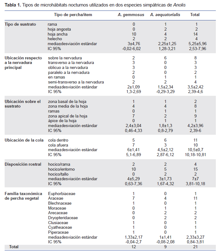 Empleando 12 horas de muestreo en cada transecto, se invirtieron 36 horas de muestreo/persona; acumulando un total de 72 horas (dos personas muestreando), se registró a 21 individuos adultos (12 individuos para A. aequatorialis y nueve para A. gemmosus). Los resultados demuestran que para A. aequatorialis la distribución vertical estuvo entre 40 cm y 140 cm de altura (79,16± 35,02). Mientras que A. gemmosus se distribuyó entre 40 cm y 160 cm de altura (87,77±41,46). No existe diferencia en la distribución vertical de ambas especies (U=49, p=0.74). En el tipo de sustrato y las cuatro categorías analizadas no se encontraron diferencias estadísticas (χ2= 5,25; GL= 3; p=0,15); el ítem hoja ancha es frecuente, 83% para A. aequatorialis y 44% para A. gemmosus (Tabla 1). No presenta diferencia entre ambas especies (U=6; p=0,57). El índice de Pianka fue de O=0,86. En la ubicación corporal con respecto a la nervadura principal no hay diferencia entre sus seis categorías (χ2=10,79; GL= 5; p=0,055); los ítems transverso y oblicuo a la nervadura son los más frecuentes (25% cada uno) para A. aequatorialis, mientras que A. gemmosus se encontró frecuente sobre la nervadura (66%, Tabla 1). No se encontró diferencia significativa entre ambas especies (U=11; p= 0,24) y O= 0.45. La ubicación del individuo sobre el sustrato de percha no presenta diferencia significativa entre sus cinco categorías (χ2=4,43; GL= 4; p=0,34); el ítem más frecuente fue en la zona apical de la hoja (58%) para A. aequatorialis, mientras que A. gemmosus fue mayormente ubicado en la parte media de la hoja (44%, Tabla 1). No existe diferencia significativa entre ambas especies (U=11; p=0,88) y O= 0,79. La situación de la cola en el sustrato de percha no presenta diferencia significativa entre sus dos categorías (χ2=1,28; GL=1; p=0,25); A. aequatorialis mostró 58% la cola fuera de la hoja, mientras que A. gemmosus obtuvo el 67% con la cola dentro de la hoja (Tabla 1). No presentó diferencia significativa entre especies (U=l; p=0,69) y O=0,88. En la disposición del rostro durante la percha no presenta diferencia significativa entre sus tres categorías (χ2=3,3; GL= 2; p=0,19); el ítem de disposición más abundante en ambas especies fue hocico/entorno en un 83% para A. aequatorialis y 56% para A. gemmosus (Tabla 1). No existe diferencia significativa entre especies (U=4; p=1) y O=0,92. El tipo de percha según la familia vegetal no presentó diferencias significativas entre sus nueve categorías (χ2=10,6; GL= 8; p=0.22), ambas especies ocurren más en la familia Araceae con un 58% y 44% respectivamente. No existe diferencia significativa entre especies (U=37; p=0,77) y O=0,76 (Tabla 1). Discusión