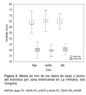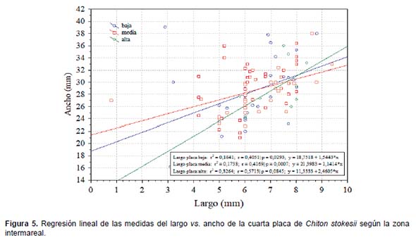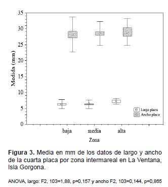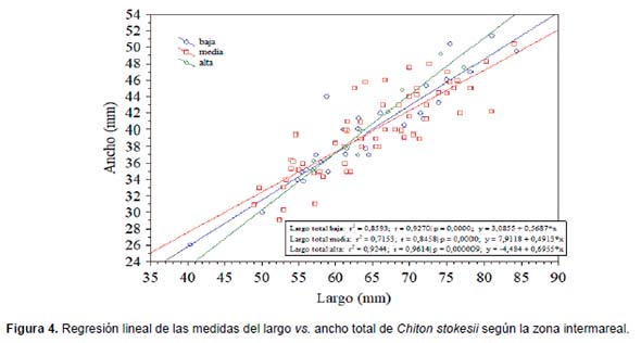 Se midieron un total de 101 individuos desde los siete hasta los 412 centímetros por encima del nivel de marea cero, de los cuales 29 se encontraron en la zona baja, 62 en la zona media y 10 en la zona alta intermareal. No se encontraron diferencias significativas entre las tres zonas intermareales para las cuatro medidas evaluadas (longitud y ancho del individuo, longitud y ancho de la cuarta placa) ANOVA (p>0,05, Figuras 2 y 3). Considerando el total de individuos, se obtuvo un promedio de largo total de 65,1+9,1 mm, ancho total 40+5,7 mm, largo de placa de 6,4+1,4 mm y ancho de placa de 28,5+4,3 mm. Todos los análisis de regresión lineal fueron significativos (p<0,05) indicando que los datos de ancho y largo se ajustan a un modelo lineal con pendiente positiva; también se encontró una mayor variación en los datos de las medidas de la cuarta placa respecto a las medidas del individuo. Sin embargo, en ambos casos el efecto de la zona intermareal no fue significativo (ANCOVA p>0,05; Figuras 4 y 5). Discusión