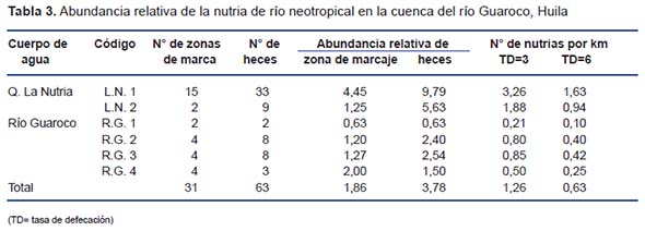 Although the Neotropical otter Lontra longicaudis has a wide distribution in the American continent and in Colombia, there are few studies on the ecology particularly at Andean enclaves. Objective: We evaluated the distribution, relative abundance, and habitat of the Neotropical otter (L. longicaudis) during the dry season (July 2012) at the tributaries of the Guaroco river basin, in the Andean arid region of La Tatacoa, Colombia. Methodology: We evaluate 23.6 km (360 man/hours) of rivers and streams, searching for evidence of the presence of the otter; each sample of the presence was mapped. Results: The presence if L. longicudis was confirmed during the dry season at the Guaroco river (relative abundance of the 9.79 feces /km) and La Nutria Creek (2.54 feces/km). The presence of the species was associated with riparian vegetation (escape cover), and characterized by the presence the larger rock and Tree trunks long. Conclusion: In the area, activities such as hunting, and degradation of aquatic and riparian habitats are endangering the permanence of the species, we recommend in increase conservation on these rivers, that constitute shelter for the otter during season dry al the Tatacoa enclave; which is why it being advisable to increase the efforts to conserve these rivers as they constitute shelter for the otter in the dry Tatacoa enclave during low rain season. Keywords: Autoecology, Conservation, Neotropical otter.
