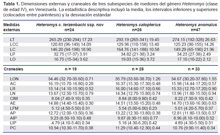Especímenes y gacetillas de las localidades (según catálogos de museos), en este trabajo Heteromys c. terzenbachi (n=28). 1. La Trampa del Tigre (1400-1940 msnm; 10°25’ N, 68°48’ O), Sector El Silencio, Parque Nacional Yurubí, Sierra de Aroa, Estado Yaracuy (MZUC-692, 696, 697, 703, 706, 711, 712, 713, 715, 716, 717, 718, 719, 720, 721, 878, 879, 1092, 1503, 1533; EBRG-29657, 29667, 29668, 29669, 29670, 29671, 29672). 2. Quebrada Palo Verde (883 msnm; 10° 26’ 02” N, 68° 48’ 18” O), sector El Tigre, Parque Nacional Yurubí, Sierra de Aroa, Estado Yaracuy (MZUC-692). Heteromys catopterius (n = 32). 3. Campamento La Justa (350 msnm; 10° 23’ N, 68° 14’ O), río Morón, Estado Carabobo (EBRG-17109). 4. Parque Nacional San Esteban, Cariaprima (1025 msnm; 10° 22’ N, 68° 02’ O), Estado Carabobo (EBRG-22006). 5. Estación Biológica Rancho Grande-Cata, Kilómetros 24-29 (680 msnm; 10° 22’ N, 67° 44’ O), Estado Aragua (EBRG-28205, 28206). 6. Cerca del refugio Pico Guacamaya (1730 msnm; 10° 22’ N, 67° 40’ O), Parque Nacional Henri Pittier, Estado Aragua (EBRG-28216, 28221): incluye, La cumbre, Estación Biológica de Rancho Grande (1500 msnm), Parque Nacional Henri Pittier (EBRG-190, 4317, 28222); Cerca del pluviómetro de Andy Field, Parque Nacional Henri Pittier (1690 msnm) (EBRG-28213). 7. Portachuelo (1100-1120 msnm; 10° 21’ N, 67° 41’ O), Parque Nacional Henri Pittier, Estado Aragua: incluye, Parque Nacional Henri Pittier, Estación Biológica de Rancho Grande, sendero La Toma (EBRG-32, 362, 363, 26991, 26993, 26995, 26996, 27353, 28203, 28223). 8. Vía Ocumare de la Costa (630 msnm; 10° 22’ N, 67° 44’ O), Parque Nacional Henri Pittier, Estado Aragua (EBRG-28218). 9. Monumento Natural Pico Codazzi (1600-2000 msnm; 10° 25’ N, 67° 17’ O), Colonia Tovar, Estado Aragua (EBRG-21736, MZUC-842, 843). 10. 5 Km S, 23-25 Km O de Caracas, Alto Ñeo León (1870-1880 msnm; 10° 26’ N, 67° 09’ O), Parque Nacional Macarao, Distrito Capital (EBRG-15083, 15084). 11. 9.4 Km al Norte de Caracas, Hotel Humboldt (10° 33’ N, 66° 52’ O), Parque Nacional Waraira Repano (El Ávila), Distrito Capital (EBRG-15052, 15053, 15054, 15056). 12. Estación Experimental El Laurel (1355 msnm; 10° 23’ N, 66° 54’ O), carretera Hoyo La Puerta, Estado Miranda (EBRG-22259). 13. 2 Km N, 4 Km O de Caripe (1170 msnm; 10° 11’ N, 63° 32’ O), cerca de San Agustín, Estado Monagas (EBRG-15086). Heteromys anomalus (n = 57). 14. Serranía de San Luis, Parque Nacional Juan Crisóstomo Falcón, sector Cumbre de Uría (1320-1370 msnm; 11° 13’ 32” N, 69° 36’ 50” O), 9 Km N de Cabure, Estado Falcón (EBRG-25312, 25314, 25315): incluye, Serranía de San Luis, Parque Nacional Juan Crisóstomo Falcón, 10 Km O + 4 Km N de Cabure, sector Cerro Galicia (EBRG-23103, 25311); Parque Nacional Juan Crisóstomo Falcón, El Haitón, municipio Petit (EBRG-23487, 23488). 15. Finca El Jaguar (800 msnm; 10° 32’ N, 68° 59’ O), 16 Km NO de Aroa, Sierra de Bobare, Estado Yaracuy (EBRG-18903, 20699, 21750, 22344). 16. El Balcón de Yaracuy (1500 msnm; 10°20’48,7”N, 68°50’05,3”O), sector Pitigüao, Sierra de Aroa, Estado Yaracuy (EBRG-29735). 17. Hacienda el Zinc (1223 msnm; 10°19’22” N, 68°51’07” O), Sierra de Aroa, municipio Sucre, Estado Yaracuy (EBRG-29414, 29415, 29416, 29417, 29418, 29436). 18. El descansadero del tigre (213 msnm; 10° 26’ N, 68° 40’ O), sector Mayorica, Parque Nacional Yurubí, Sierra de Aroa, Estado Yaracuy (EBRG-29630, 29631; MZUC-398, 399): incluye, Mayorica, pica hacia Guayabito, Parque Nacional Yurubí, Sierra de Aroa (MZUC-1127). 19. Cuenca de Las Minas (700 msnm; 10° 22’ N, 68° 52’ O), sector Los Bacos, Sierra de Aroa, Estado Yaracuy (EBRG-23621). 20. Cerro Zapatero (1227 msnm; 10° 13’ 82” N, 68° 38’ 28” O), Macizo de Nirgua, Estado Yaracuy (MZUC-693). 21. Finca Cujigacho (500 msnm; 10° 14’ N, 67° 52’ O), Guacara, Estado Carabobo (EBRG-28173). 22. Fila La Josefina (1350 msnm; 10° 20’ N, 67° 55’ O), 11 Km NO de Tronconero, Parque Nacional San Esteban, Estado Carabobo (EBRG-10146, 10174, 10202). 23. Hacienda Saint Jean (120 msnm; 10° 26’ 00” N, 67° 58’ 00” O), 13 Km SE de Borburata, Estado Carabobo (EBRG-8167, 8186). 24. Quebrada Yapascua (0-100 msnm; 10° 23’ 00”N, 67° 53’ 00” O), bosque de galería Yapascua, Parque Nacional San Esteban, Estado Carabobo (EBRG-8171, 8193). 25. El Limón, Estación de Fauna (450 msnm; 10° 19’ N, 67° 39’ O), Parque Nacional Henri Pittier, Estado Aragua (EBRG-131, 133, 27354): incluye, Parque Nacional Henri Pittier, cumbre Turiamo (EBRG-359, 360); Estación de Piscicultura del Ministerio de Agricultura y Cría, El Limón, Maracay, (EBRG-188, 28171); Estación Biológica de Rancho Grande, Cata, Km 36, Parque Nacional Henri Pittier (EBRG-28184, 28186); La Trilla, Parque Nacional Henri Pittier (EBRG-28185, 28192); Parque Nacional Henri Pittier, 4.6 Km. S de Rancho Grande por carretera (EBRG-16955); Parque Nacional Henri Pittier, Estación Biológica de Rancho Grande (EBRG-15047, 15048, 15049). 26. Carretera Rancho Grande-Ocumare (250-500 msnm; 10° 23’N, 67° 45’ O), Parque Nacional Henri Pittier, Estado Aragua (EBRG-28178, 28179, 28180, 28181, 28182, 28187). 27. Parque Nacional Macarao, Cerro Geremba (2337 msnm; 10° 24’ 37.4” N, 67° 12’ 42.2” O), Estado Miranda (EBRG-27461). 28. Quebrada Yoraco (400 msnm; 10° 12’ N, 63° 55’ O), cerca de Las Trincheras, base Turimiquire, Estado Sucre (EBRG-8196). 29. Río Neverí (450 msnm; 10° 20’ 17” N, 64° 17’ 56” O), Parque Nacional Mochima, Paraminal, municipio Raúl Leoni, Estado Sucre (EBRG-23021). Apéndice 2