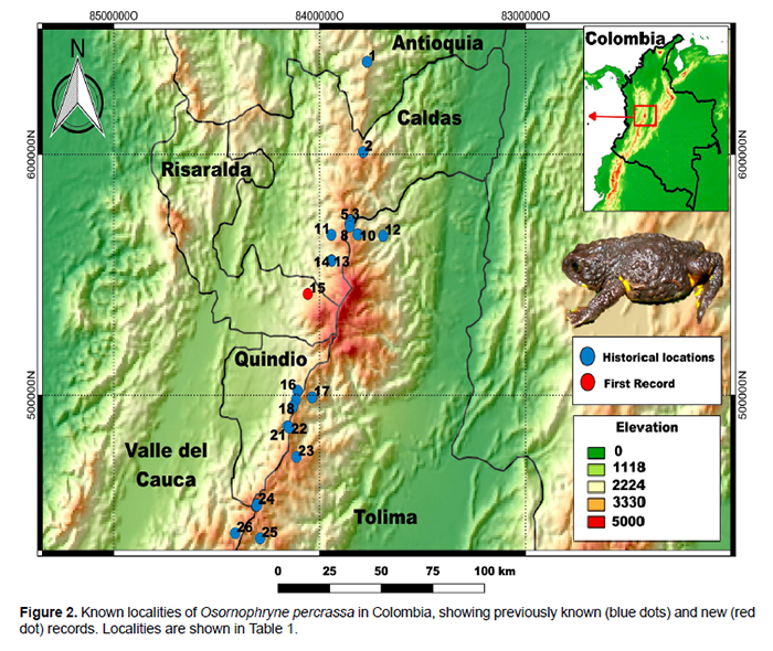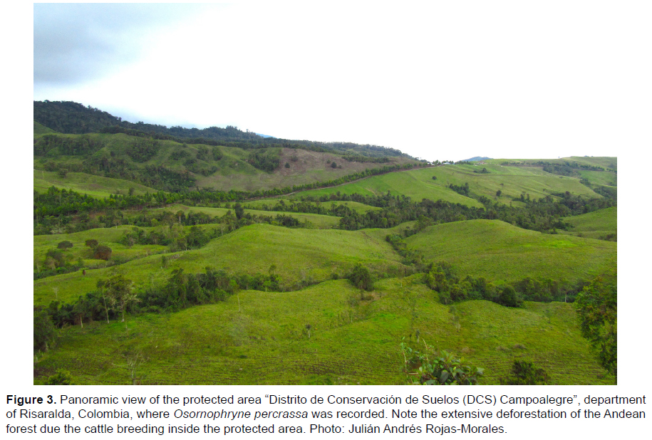 The Andean toad genus Osornophryne is an endangered lineage composed by 11 currently described species, confined to a small, but topographically complex biogeographic area (northern Andes of Colombia and Ecuador) (Páez-Moscoso and Guayasamin 2012). Five species occur in Colombia, which are: O. antisana Hoogmoed 1987, O. bufoniformis (Peracca 1904), O. guacamayo Hoogmoed 1987, O. percrassa Ruiz-Carranza and Hernández-Camacho 1976, and O. talipes Cannatella 1986 (Vanegas-Guerrero et al. 2016). Among these species, the Colombian endemic plump toad O. percrassa (Figure 1) is restricted to the Colombian Central Andes in the departments of Antioquia, Caldas, Quindío, Tolima and Valle del Cauca (from north to south), at elevations between 2700 and 3840 m (Hoogmoed 1987, Vanegas-Guerrero et al. 2016). Osornophryne percrassa is a leaf-litter dwelling species, commonly found under rocks and debris in trails borders and roads, inside the Andean forests and “Páramos”; however, it has not been recorded in open disturbed habitats (Bernal and Quevedo 2004, Vanegas-Guerrero et al. 2016). Several aspects about its morphology, habitat use, behavior, and geographic distribution have been discussed in different works (Ruiz-Carranza and Hernández-Camacho 1976, Escobar-Lasso and González-Duran 2012, Burbano-Yandi et al. 2015, Vanegas-Guerrero et al. 2016). Osornophryne percrassa is listed as Endangered (EN) under criteria B1ab (iii) (IUCN 2015) and is listed as “Vulnerable” on the Colombian Red List of Amphibians, because the known geographical distribution is less than 5.000 km2 and its suitable habitat on the Colombian Central Mountain range is fragmented and declining, both in extent and quality (Bernal and Quevedo 2004). Also, O. percrassa is listed as an Endangered species by the Colombian Ministerio de Ambiente y Desarrollo Sostenible (MADV 2017). A potential distribution model showed a larger area of suitable habitat than was previously assumed for O. percrassa, including areas around the National Natural Park Los Nevados (Vanegas-Guerrero et al. 2016). Here we provide new information about the distribution of the plump toad O. percrassa, based on first records of this species for the department of Risaralda. Also, we have gathered and updated all known localities throughout the distribution range of O. percrassa, which might be used to do spatial analysis and design conservation actions. Two specimens of O. percrassa were recorded in Andean forest at the sector of El Retén, road to Potosí, municipality of Santa Rosa de Cabal, department of Risaralda, Colombia (04°51’48” N; 75°30’39” W, WGS84, elevation 2856 m). This locality is located inside the protected area “Distrito de Conservación de Suelos (DCS) Campoalegre”. A juvenile individual (lacking testes, 19.6 mm snout-vent-length) was collected on 19 April 2013 at 17:30 h, on a concrete wall at the edge of a fragment forest, and an adult male (22.8 mm SVL) was observed on 5 august 2017 at 11:00 h, under a rotten trunk. Both specimens show the diagnostic characteristics of the species: truncated snout with non-projected papilla and light-yellow spots on the belly (Figure 1A) (Ruiz-Carranza and Hernández-Camacho 1976, Páez-Moscoso and Guayasamin 2012). The specimens were photographed, but only first individual was euthanized and deposited at the amphibian’s collection of the Universidad de Santa Rosa de Cabal (accession number CUS-A 0012); the second specimen (Figure 1B) was photographed and released in the same place where it was found. These are the first records of O. percrassa for the department of Risaralda, filling a geographical gap between the known localities reported in Caldas and Quindío departments (Figure 2, Table 1). The record of O. percrassa in Risaralda was highly predictable, taking into account the distribution model showed by Vanegas-Guerrero et al. (2016). Individuals of O. percrassa were found inside a protected area DCS Campoalegre, but it is important to highlight that this category is not strict and rigorous in terms of biodiversity conservation, since it allows different uses of lands, such as livestock and agricultural exploitation, as we observed between the years 2014 and 2017 (Figure 3). In this way, it corresponds to Corporación Autónoma Regional de Risaralda (CARDER), to take necessary measures to avoid the cattle breeding expansion and agricultural frontier, over the natural Andean forests where O. percrassa and other endemic and threatened amphibians have been found, such as Centrolene quindianum and Andinobates bombetes (Mantilla et al. 2015). Unfortunately, O. percrassa doesn’t have a national conservation plan throughout its distribution range. Therefore, it is really important to do it with a committed network between researchers, NGO’s, universities and local communities. To date, there are known 26 records of O. percrassa throughout its distribution range (Table 1). These records are distributed in five departments (Antioquia, Caldas, Quindío, Tolima and Valle del Cauca), and only in the department of Caldas has been established a conservation plan of the species in its territory (Burbano-Yandi et al. 2015). Therefore, is really urgent develop a conservation plan for this species in the territory of Risaralda. Acknowledgements