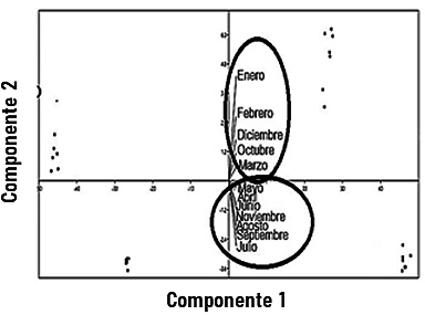Parámetros físicos del agua. Las variables ambientales presentaron importantes variaciones en el tiempo con respecto a las registradas por la estación de trabajo (Tablas 1 y 2). El ACP definió dos temporadas (Figura 2a): la primera de enero, febrero, marzo, octubre y diciembre (meses de estiaje, excepto octubre); la segunda entre abril, mayo, junio, julio, agosto, septiembre y noviembre (meses de lluvias). El ACP mostró que las estaciones 6 y 7 fueron similares, mientras que las estaciones de la 1 a la 5 presentaron similitud (Figura 2b); sin embargo, si bien las estaciones 6 y 7 fueron similares, estas se encuentran separadas físicamente. Figura 2. Análisis de componentes principales (ACP) temporal de los parámetros